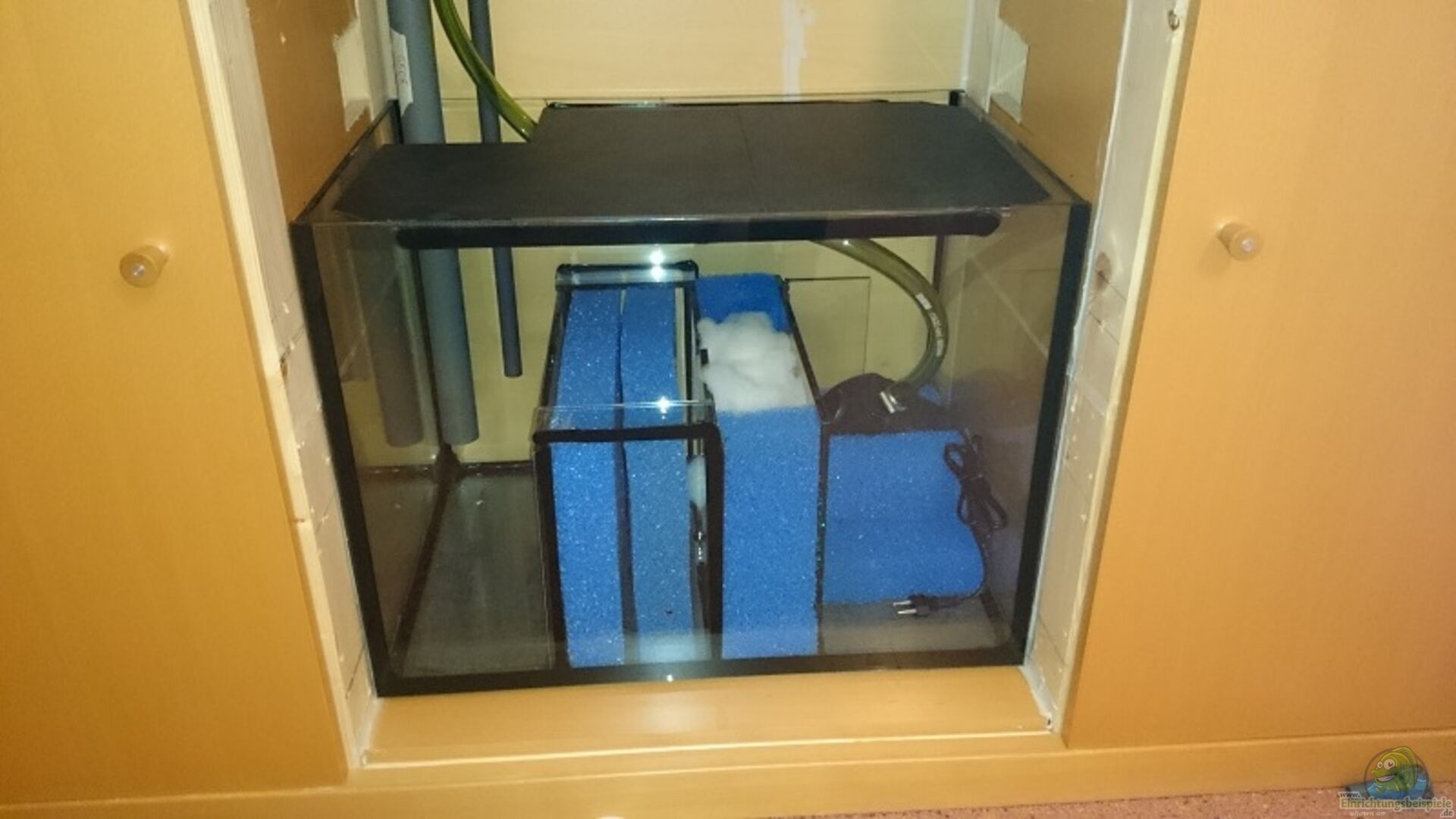 Sonderanfertigung "Brillant Rechteck-Aquarium" mit ungewöhnlichen Ma??en (152 x 52 x 61), 482 Liter Volumen mit ??berlaufschacht und zwei Kammern fast mittig in dem Becken. Unterschrank "Brillant Aquarium" mit 112 cm Höhe. Gesamthöhe der Anlage, Becken mit Unterschrank und Futterautomaten ca. 185cm. Die perfekte Blickhöhe im Esszimmer auf das Becken.