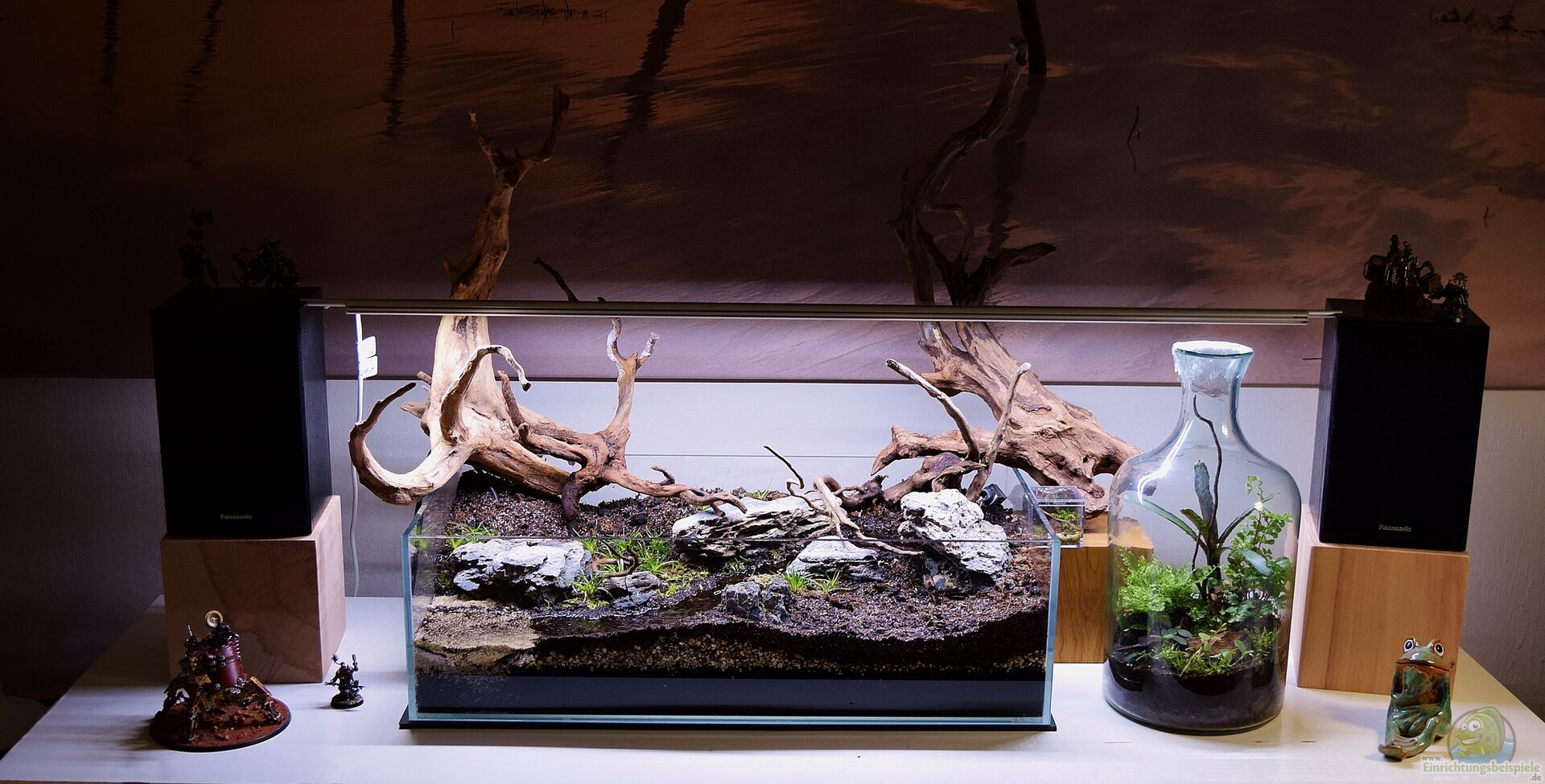 Es handelt sich hier um ein niedriges Weissglasbecken, das nach oben hin offen ist. Hier wurde versucht eine Miniatur-Moor-Landschaft nachzubilden. Eine versteckte Pumpe versorgt einen künstlichen Bachlauf mit Wasser. Um den Bachlauf möglichst naturnah zu konstruieren, wurde Weisstorf gesiebt, um die Feinanteile zu erhalten und anschliessend mit Aquariensilion vermischt. Mit dieser Masse wurde der Bachlauf modelliert.