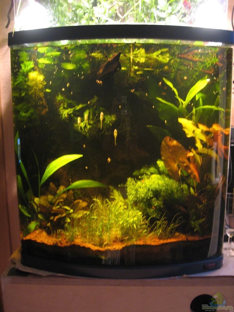 Offenes Aquarium mit viel Bepflanzung oberhalb des Wasserspiegels. Die vier Filterkästen hinter dem vorderen Aquarienbereich sind nicht mit Wasser gefüllt sondern werden als Pflanzkästen genutzt. Au??erdem befindet sich rechts vom Aquarium ein weiterer Pflanztopf mit Bepflanzung. Als Aufbau befinden sich über dem Aquarium Weidenäste, welche mit Flechten und Orchideen bepflanzt sind.