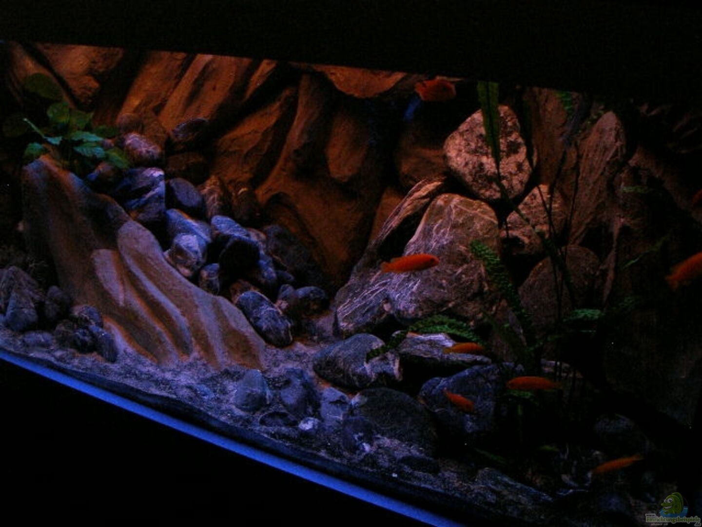 Selbstgebaute und zum Teil hinterschwimmbare Rückwand. Ziel war es, eine Rückwand zu gestalten die ziemlich Naturnah ist, und den Ansprüchen der Fische entspricht. Als Motiv diente ein gemachter Ausschit aus dem Video "Fastzination Malawiesee". Diese war wirklich nicht einfach zu gestalten, aber unterm Strich denke ich, dass es uns einigerma??en gut gelungen ist. Bisher hat sich aber noch keiner beschwert. ;-) Steine (aus dem Baumarkt) etwa 20KG