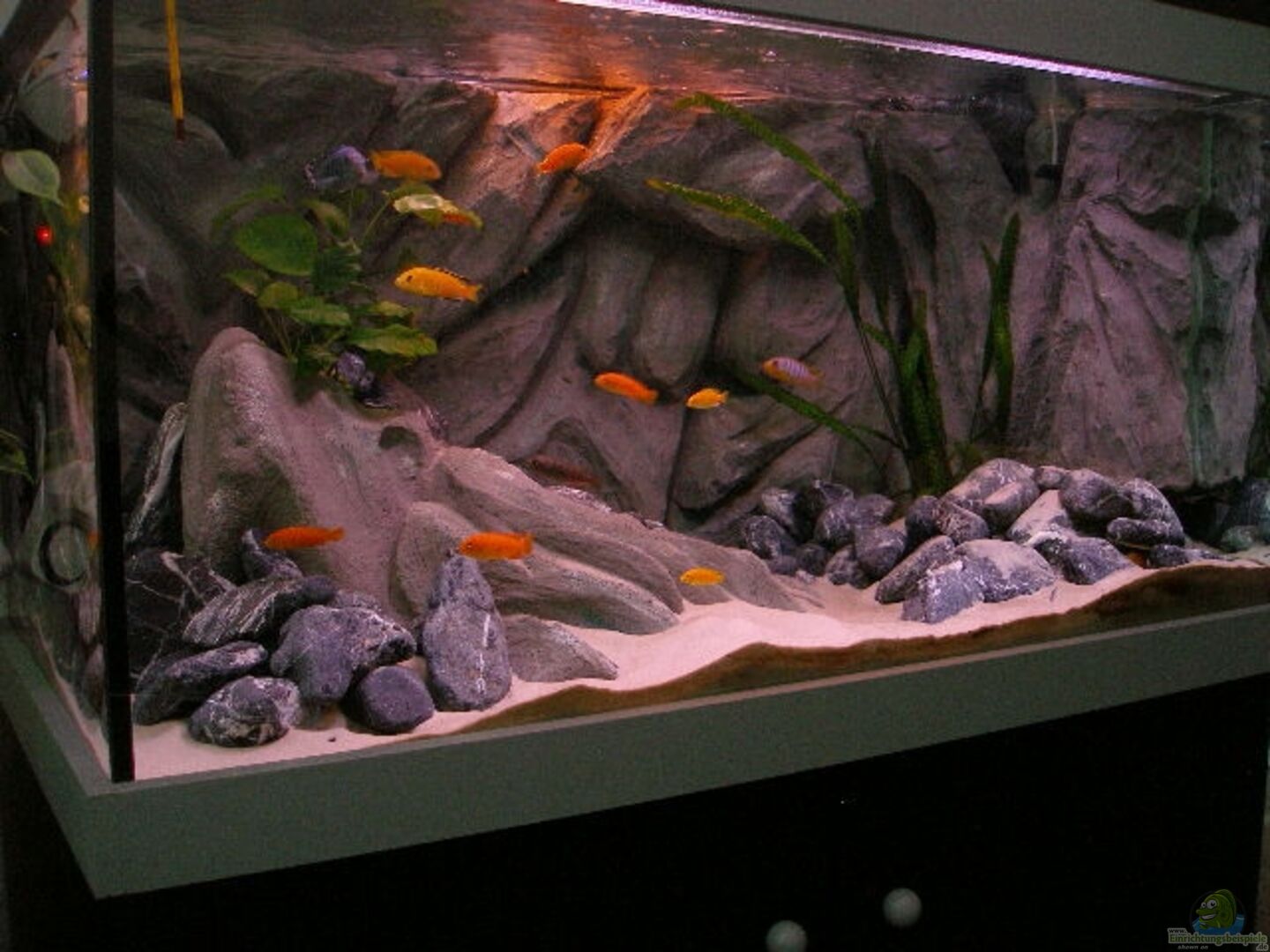 Selbstgebaute und zum Teil hinterschwimmbare Rückwand. Ziel war es, eine Rückwand zu gestalten die ziemlich Naturnah ist, und den Ansprüchen der Fische entspricht. Als Motiv diente ein gemachter Ausschit aus dem Video "Fastzination Malawiesee". Diese war wirklich nicht einfach zu gestalten, aber unterm Strich denke ich, dass es uns einigerma??en gut gelungen ist. Bisher hat sich aber noch keiner beschwert. ;-) Steine (aus dem Baumarkt) etwa 20KG