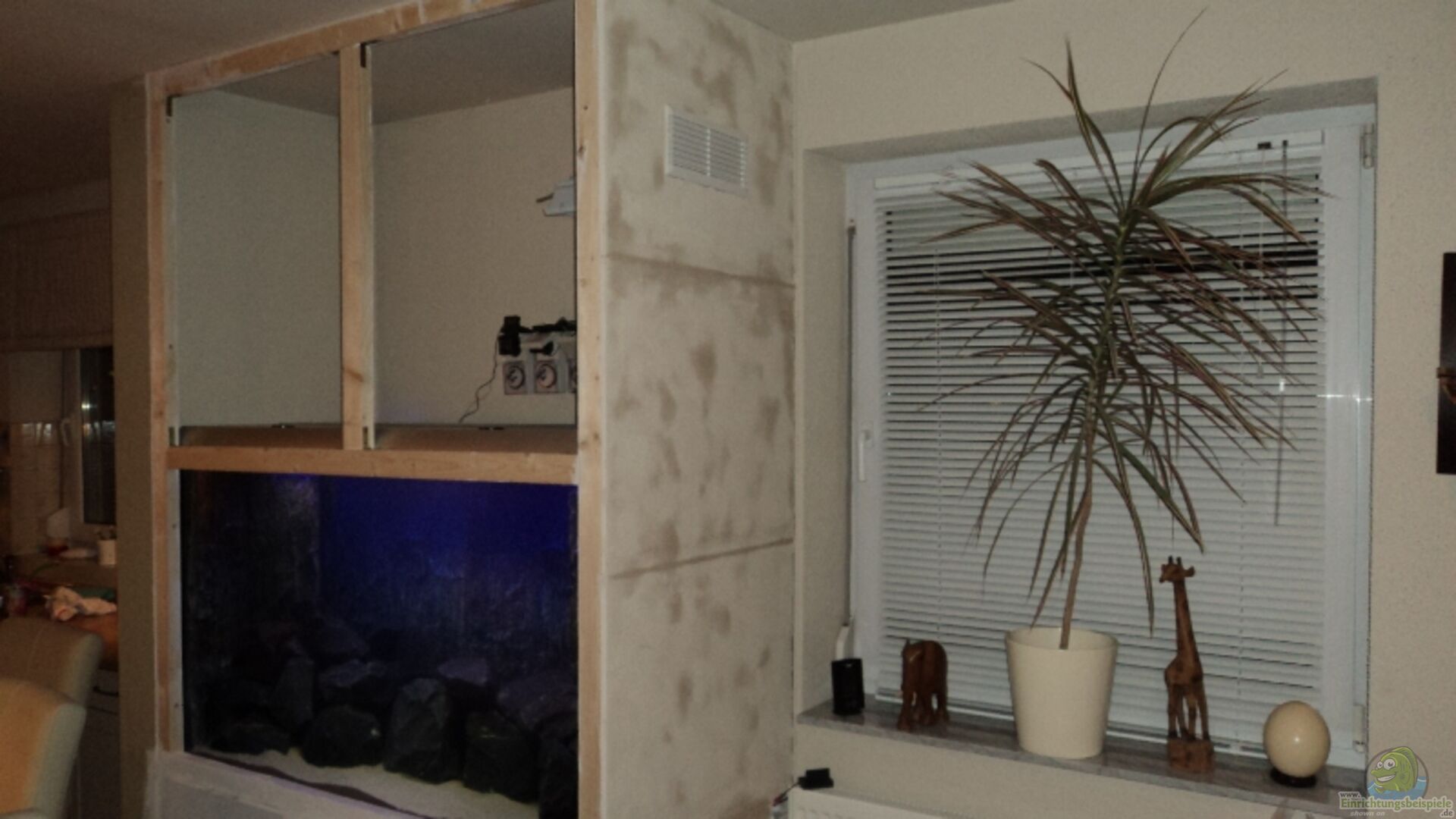 Das Becken ist aus 17 mm Floatglas gefertigt und ist sto?? Verklebt. Die Abeckdung ist ein Aluminiumabdeckeung mit zwei T5 Leichten und zwei Futterklappen. Das Becken ist eine Sonderanfertigung , um möglichst viel Wasservolumen zu bekommen habe ich die Höhe von 90 cm gewählt . Eine andere Grö??e wäre nicht gegangen weil es sonst nicht genau in die Ecke gepasst hätte. Den Unterschrank habe ihn komplett selber gebaut. Der Unterschrank steht auf altem Gewebeteppich um die Unebenheiten [...]