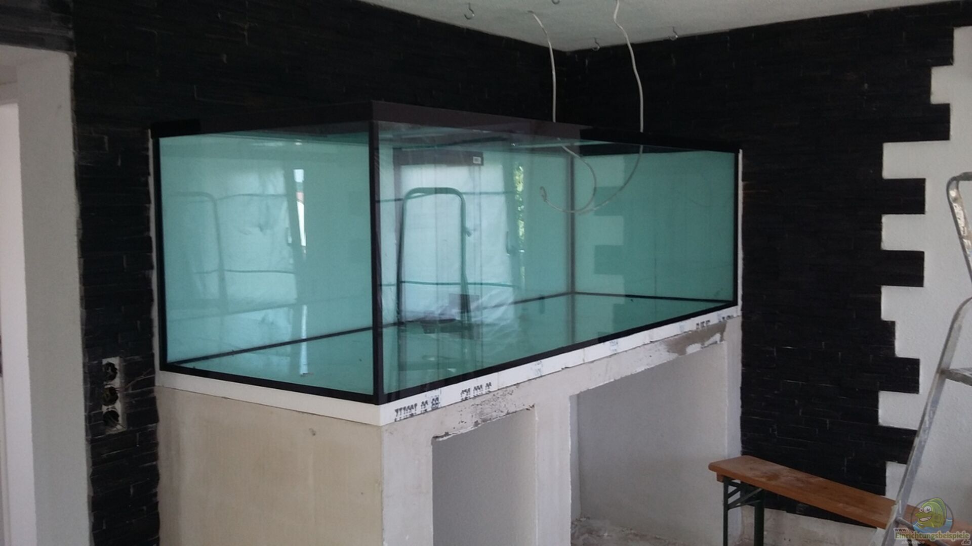 Das Becken ist eine Sonderanfertigung aus 15mm starken Floatglas mit Wasserstandsblenden aus Schwarzglas. Mittig an der Rückwand wurde ein Doppelwändiger Filterschacht mit bodennaher Ansaugung und ??erlauf eingeklebt. Im Schacht befinden sich zwei 55mm Lochbohrungen. 1x für den Filtereinlauf und 1x als Notüberlauf. Eine dreiteilige Glasabdeckung mit kleinen Futteröffnungen verhindert eine grö??ere Wasserverdunstung. Der Aquariumunterschrank wurde aus Ziegelsteinen selbst gemauert und durch [...]