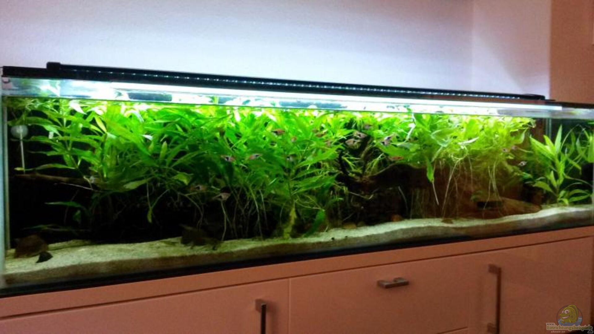 Wieder einmal handelt es sich bei dem Becken um eine Sonderanfertigung, die diesmal passend zum Sideboard gefertigt wurde. Hersteller ist die Firma Aquarienbau Voigt in Werneuchen bei Berlin. Das Becken wurde aus 8mm starkem Floatglas gefertigt und mit transparentem Silikon geklebt. Passgenau dazu habe ich mir eine dreiteilige Glasabdeckung von der Fa. Voigt anfertigen lassen, welche in zwei Kunststoff-E-Profilen auf der gesamten Beckenlänge verschiebbar ist. Als zusätzlichen Service wurden mir [...]