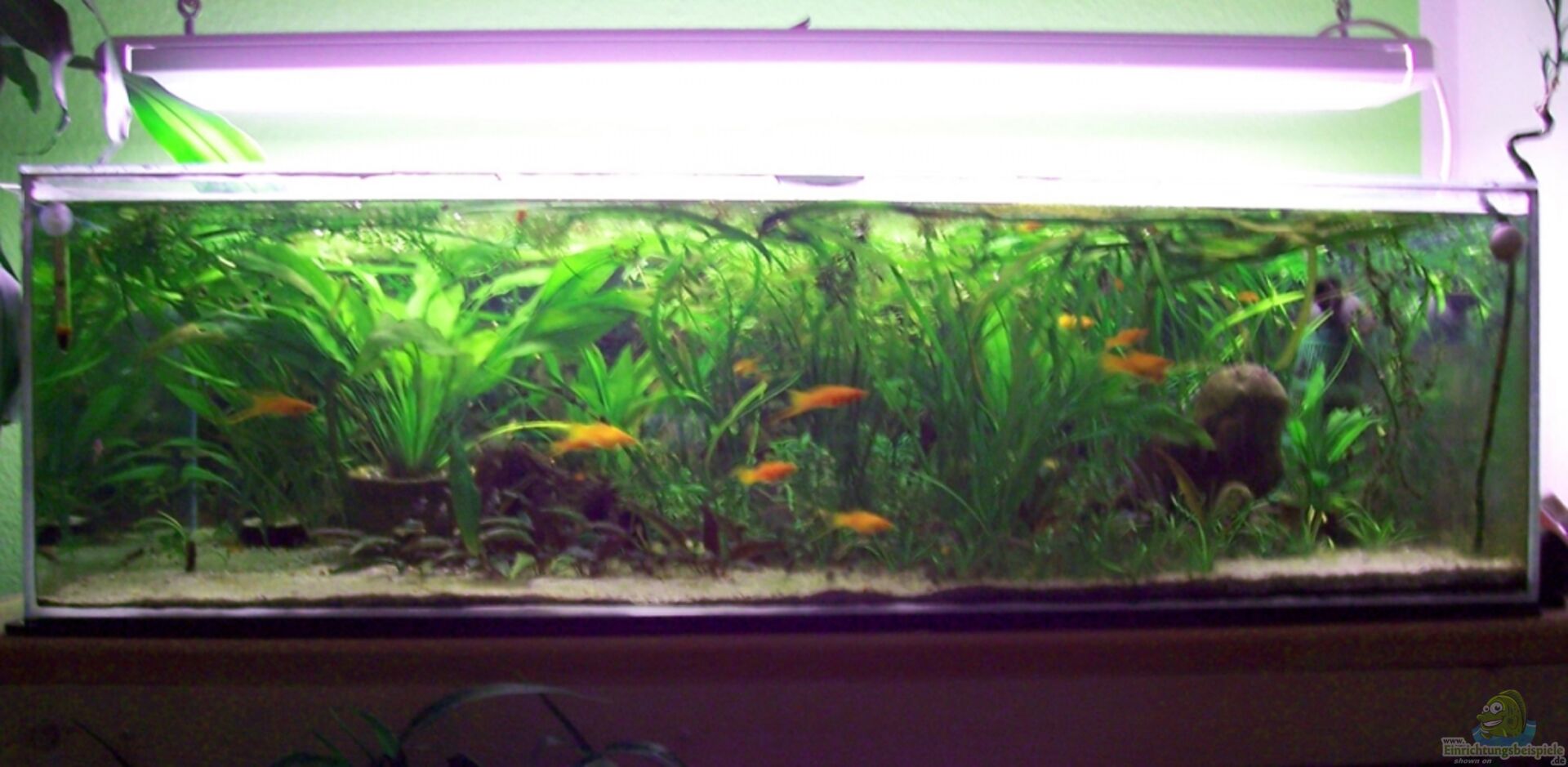 Das Becken wurde vom Vorbesitzer zur Zucht von Zebrawelsen verwendet. Ich fülle es nie bis zum Rand, sondern lasse ca. 3cm Platz zur obersten Kante. Der Unterschrank ist Eigenbau ohne Mittelpfeiler, da früher dort noch ein Kleintierstall integriert war. Die Abdeckung ist eine einfache, drauf gelegte Plexiglasscheibe ohne alles.