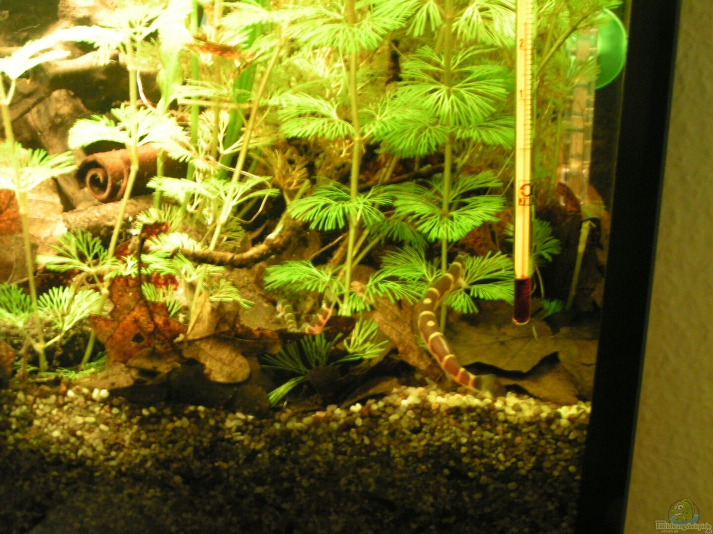 10 Pangio kuhlii sumatranus (Dornauge) Balzverhalten am 7.3.2013 Heimat: Südostasiatischer Raum Grö??e:10-12cm Weibchen: etwas fülliger, rundliche Brustflossen, Laichansatz schimmert grünlich am Bauch durch Männchen: schlanker , sichelförmige Brustflossen Empfohlene Wasserwerte: Temperatur 24-29°C; pH 5, 5-7; GH 5-15 Der Name Dornauge kommt daher, das dieser Fisch einen kleinen Dorn unetr dem Auge hat welcher als Verteidigungswaffe dient. Es handelt sich um einen sehr friedlichen [...]