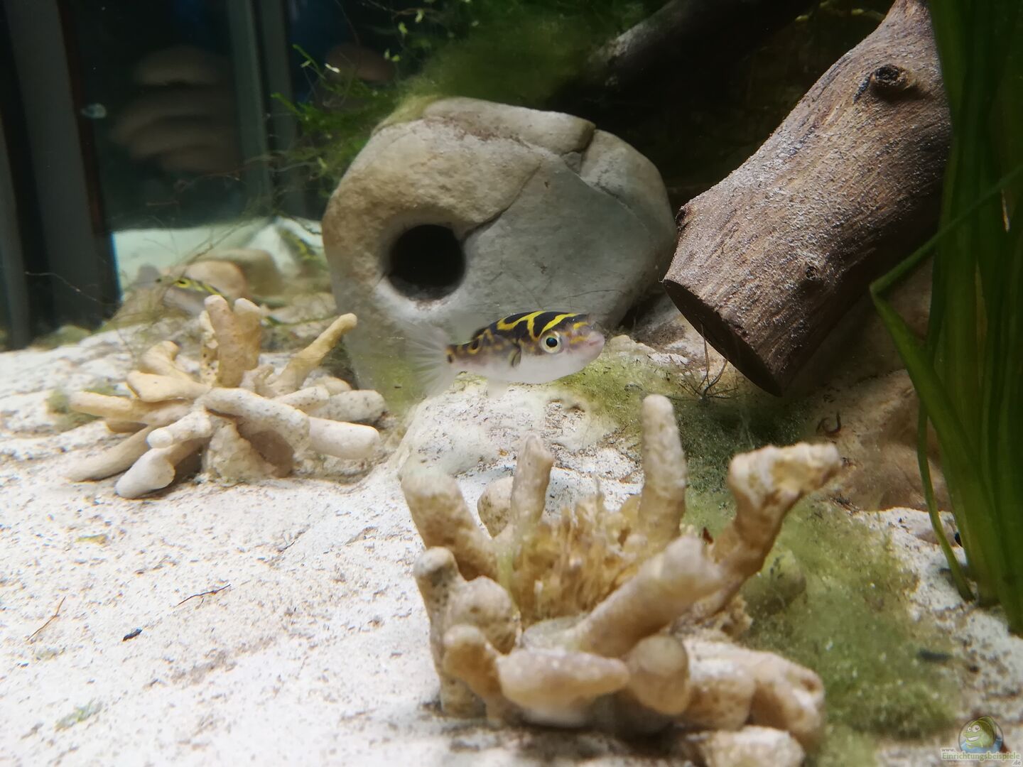 Das Becken ist ein reines Art-Aquarium, mit 2 Kugelfischen (Tedradon Biocellatus). Die Fische sind untereinander sehr friedlich, keine Spur von Aggression (was bei Kugelfischen allgemein eher selten ist) !
