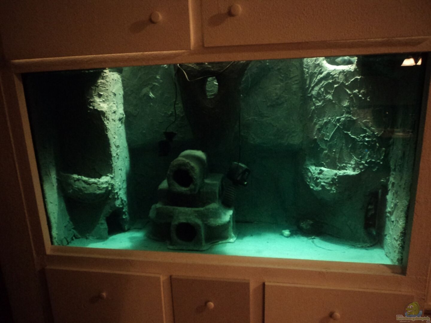 Das Becken ist aus 17 mm Floatglas gefertigt und ist sto?? Verklebt. Die Abeckdung ist ein Aluminiumabdeckeung mit zwei T5 Leichten und zwei Futterklappen. Das Becken ist eine Sonderanfertigung , um möglichst viel Wasservolumen zu bekommen habe ich die Höhe von 90 cm gewählt . Eine andere Grö??e wäre nicht gegangen weil es sonst nicht genau in die Ecke gepasst hätte. Den Unterschrank habe ihn komplett selber gebaut. Der Unterschrank steht auf altem Gewebeteppich um die Unebenheiten [...]