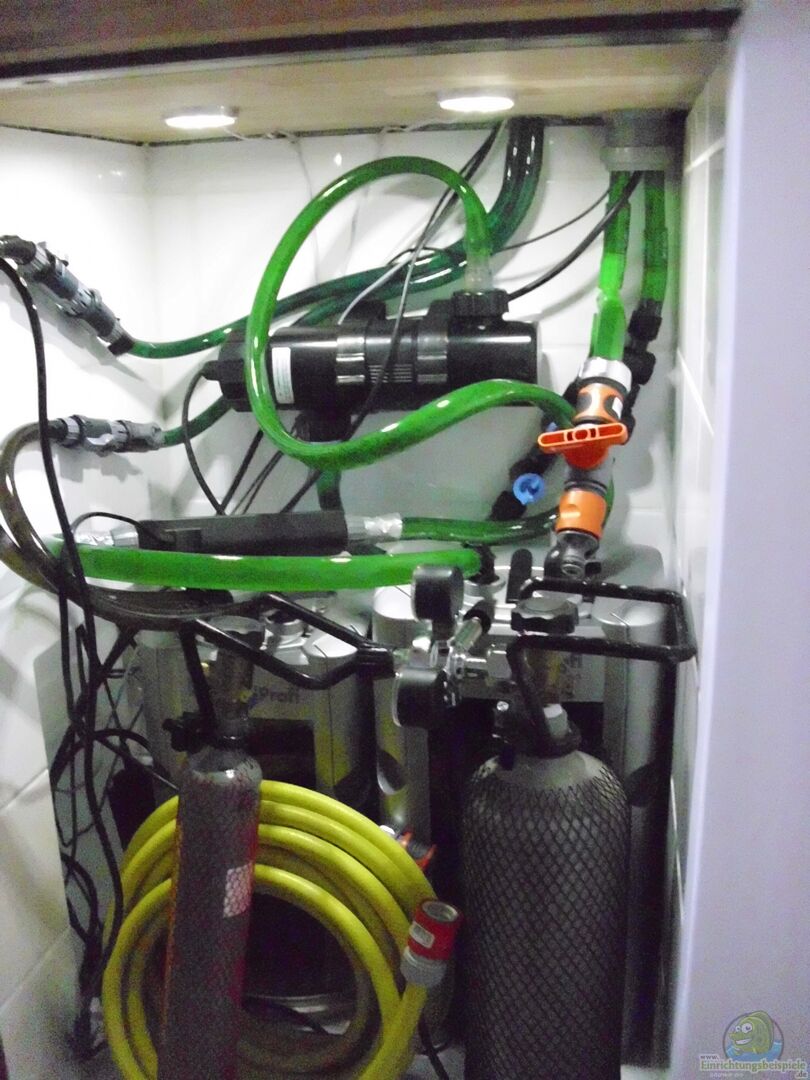 Bodenfluter, UV Filter, 10 - 300 Watt Durchlaufheizer. Tunze Wasserstands Nieauregulierung mit Nachfüllbehälter. Tunze Nanostream 6215 Strömungspumpe, Co2 Druckgasanlage mit UP Inline Atomizer, PH Mess und Regelgerät mit PH elektrode und und Schaltung für Magnetventil.