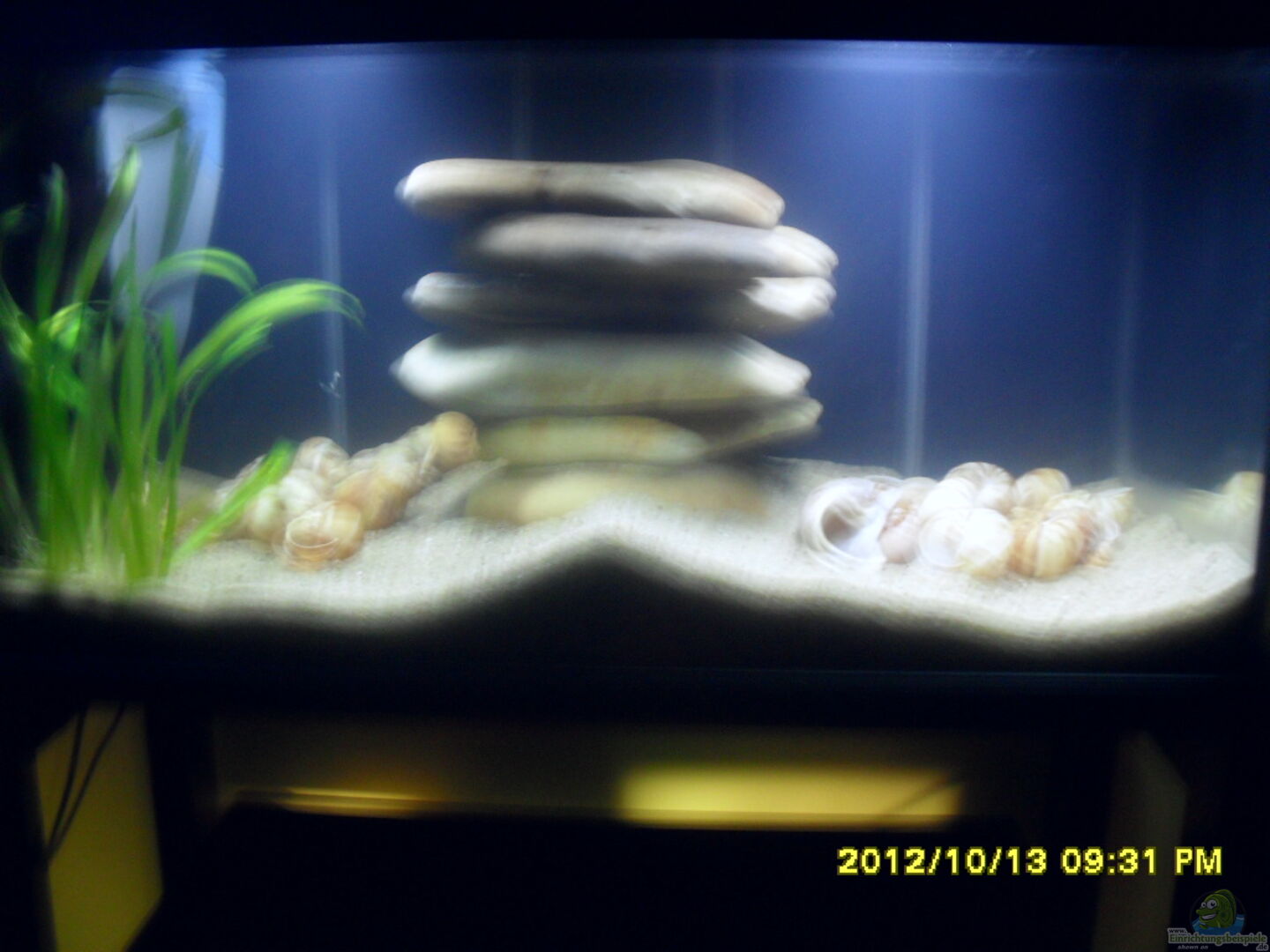 Es handelt sich hier um ganz normales Standartbecken mit Abdeckung von MP. Das Becken steht auf einem selbstgebauten Regal in schwarz, auf das 2 Aquarien passen. Das Becken war vorher ein Aufzuchtbecken für Malawis ("Mbuna Dream 1"), da sich die Aufzucht aber nicht lohnt (ich bin den Nachwuchs nie los geworden), habe ich mich entschlossen aus dem Becken ein Schneckenbuntbarsch Aquarium zu machen. Und hier ist es: !!!