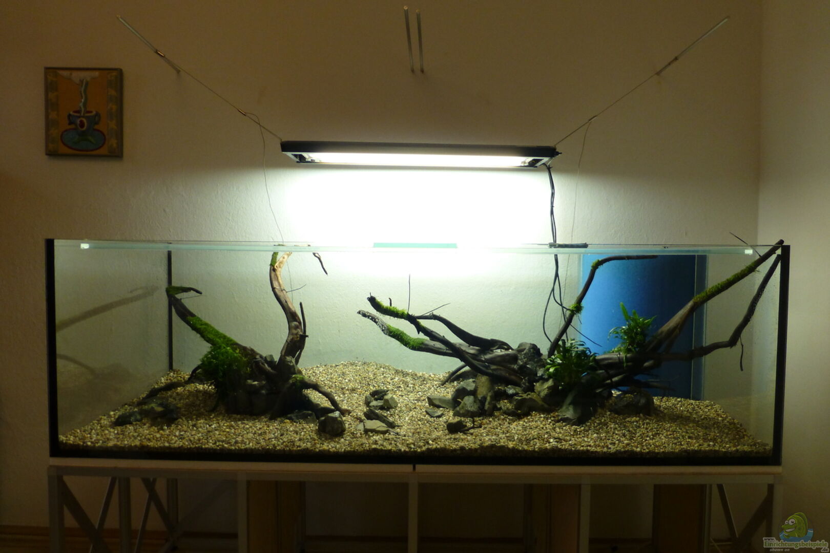 Das Becken ist eine Sonderanfertigung aus 12mm starken Floatglas, diamantgeschliffen und auf Sto?? verklebt. Leer wiegt es 145kg und es dauerte 20min bis es im 3.OG auf dem Schrank stand. Im rechten Bereich wurden jeweils zwei schmale Glasstreifen (Dicke 5mm) zur Aufnahme der Filtermatte des HMF eingeklebt. Zur Stützung der Matte gegen den Kies wurden auf der Bodenplatte senkrecht drei 8cm hohe Gleisstreifen gleicher Dicke geklebt. Zwischen diesen senkrechten ???Platten??? sind Spalte, sodass [...]