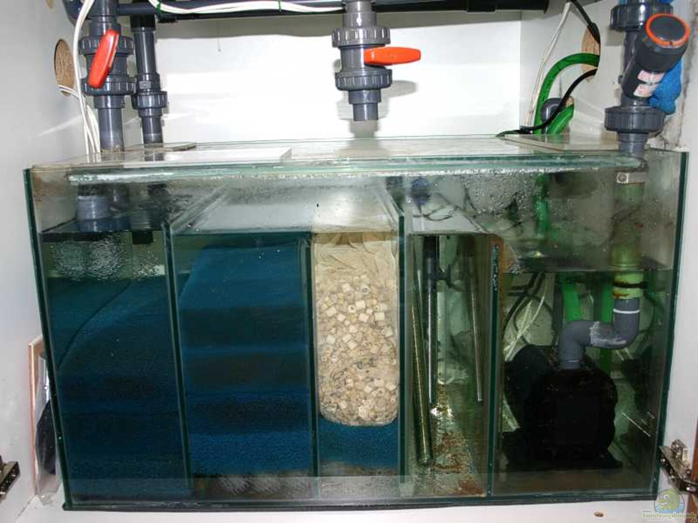 Ozonanlage: Das Ozon wird in einem alten Meerwasserabschäumer eingeleitet. Das Wasser kommt direkt aus der Klarwasserkammer des Hauptfilters, und läuft aus dem Abschäumer in die erste Kammer des Filters wieder zurück. So entsteht nur ein Filterinterner Kreislauf, das Ozon kommt nie direkt ins Aquarium. Der Ozonisator wird über ein Redoxpotential-Messgerät gesteuert. Den Wert halte ich zwischen 270 ??? 330 mV. Regelheizstäbe (300Watt/150Watt). Angeschlossen an ein Temperatur-Regelgerät [...]