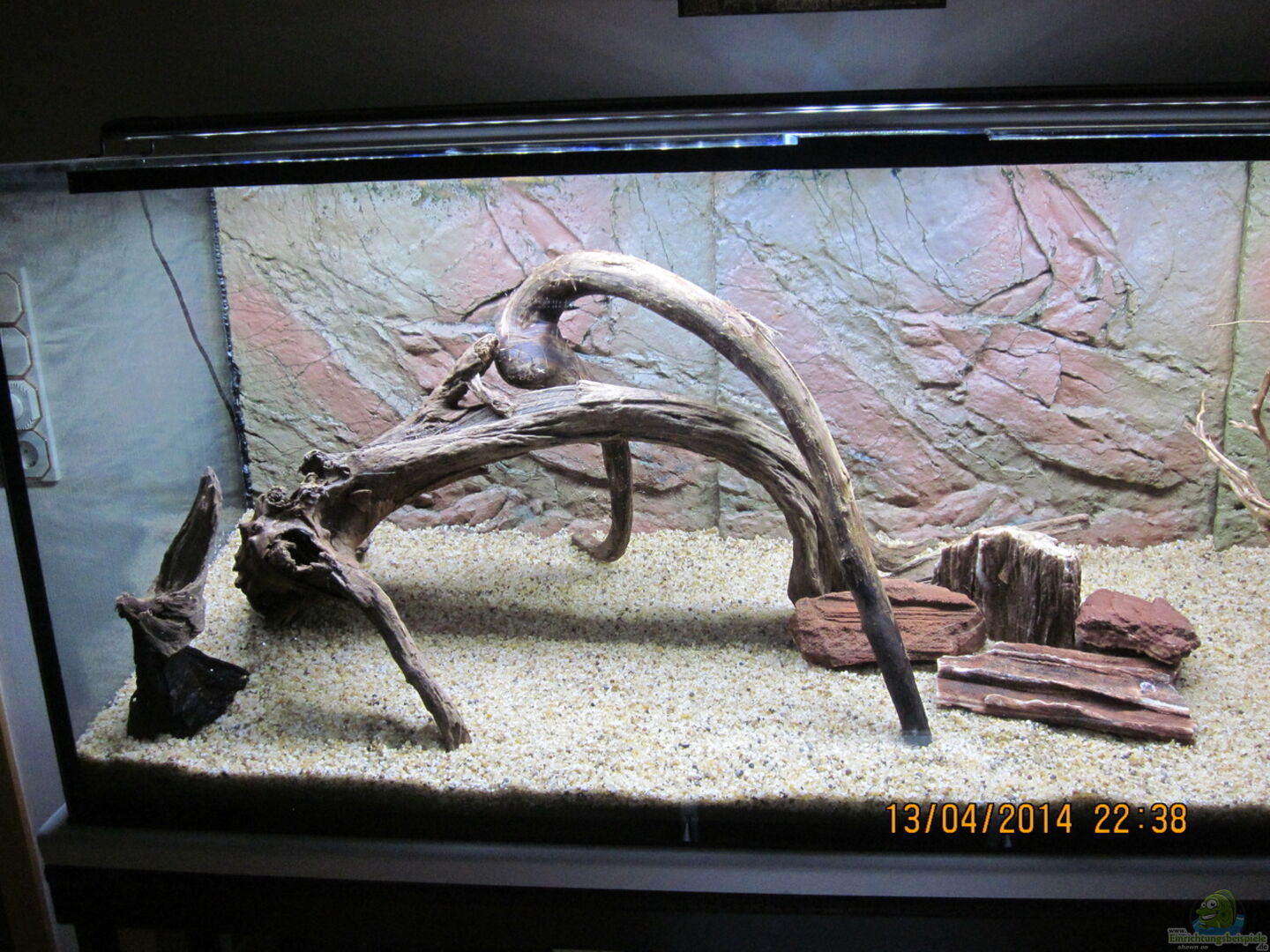 Vier verschieden grosse Morkienwurzeln, versteinerte Wurzeln, zwei Tonröhren, eine Wasserschale aus Kunststoff in Felsoptik(befüllt mit Sand für meine Corys), eine Kokosnusshöhle, eingeklebte Rückwand aus Ton, versteinertes Holz. 15.02.2015 Noch einige Tonröhren hinzugefügt, für die neuen Mitbewohner(3xL333).