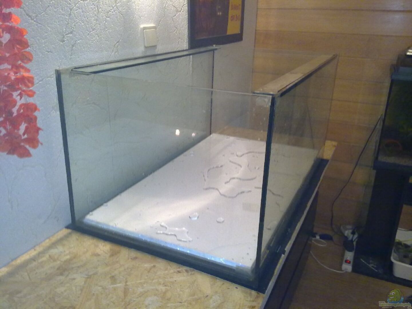 schön tiefes Becken 8mm Glas; sto??verklebt mit Sicherheitsnaht Abdeckung durch Glasplatten wodurch ich finde das die ganze Tiefe des Beckens zur Geltung kommt und man die Tiere auch mal von oben beobachten kann 1 x Styroporplatte zum Schutz der Bodenplatte 2cm stark 1 x Acrylplatte 6mm zum Schutz der Bodenplatte 1 x Lage Antirutschmatten aus Gummi um Unebenheiten auszugleichen Rückwand besteht momentan leider nur aus einer Fotofolie die den Marmor wiederspiegelt Wird [...]