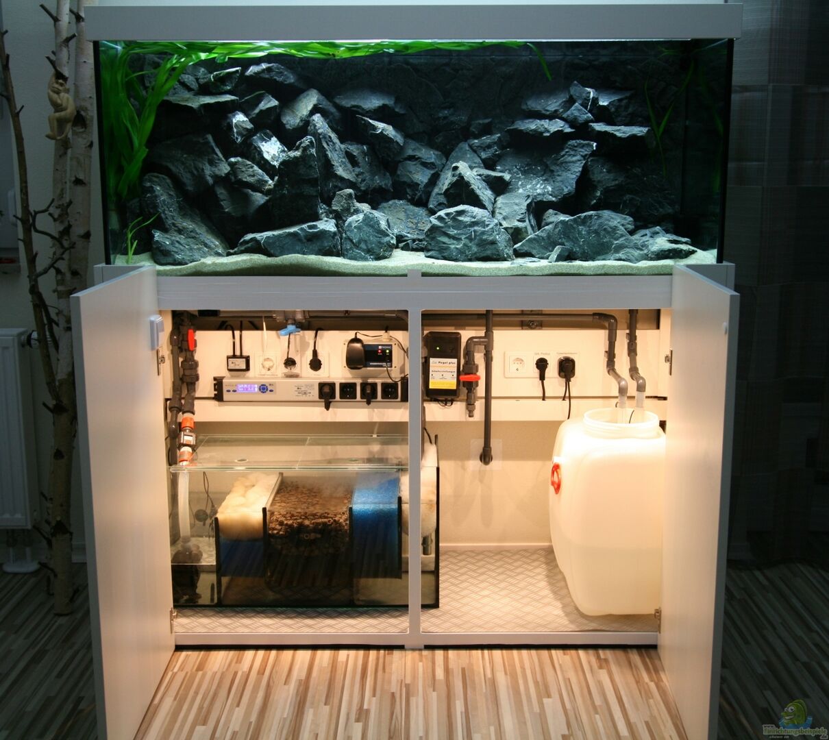 Das Aquarium steht auf einem 30x30mm vierkant Stahlrohr-Untergestell, nach dem Schweissen wurde das Gestell pulverbeschichtet und von meinem Schreiner-Freund mit hochwertigen Spanplatten (19mm) aus dem Küchenbau verkleidet. Die Spanplatten und Kanten sind Melamin beschichtet und somit sehr Wasserfest! Die Türen sind mit Klick-Topfbändern versehen was das entfernen wenn nötig komfortabel gestaltet. Das Becken hat vier Bohrungen, Drei im ??berlaufschacht für Ab/Zu-leitung plus Notüberlauf [...]
