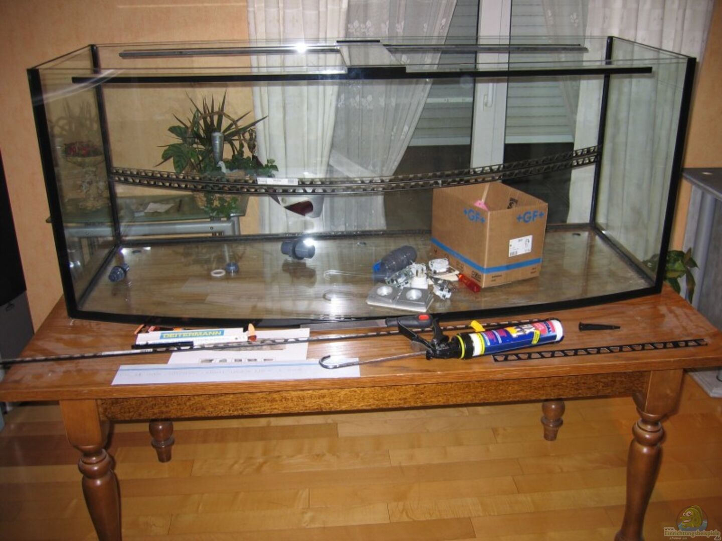 Wulstverklebtes Becken mit gewölbter Frontscheibe ohne Abdeckung, Mittelstrebe und zwei Längststreben, 12 mm Glastärke. 5 Bodenlochbohrungen. Zwei schwarze Schlütterleisten in denen eine Edelstahllblende eingesetzt ist als obere und untere Blende. Back to Nature Rückwand Woodrock 150 x 50 , 1 Bodenmodul zersägt und am unteren Rand der Rückwand angepasst da diese zu kurz war. Unterschrank Kieferpanele (Baumarkt) patiniert und versiegelt.