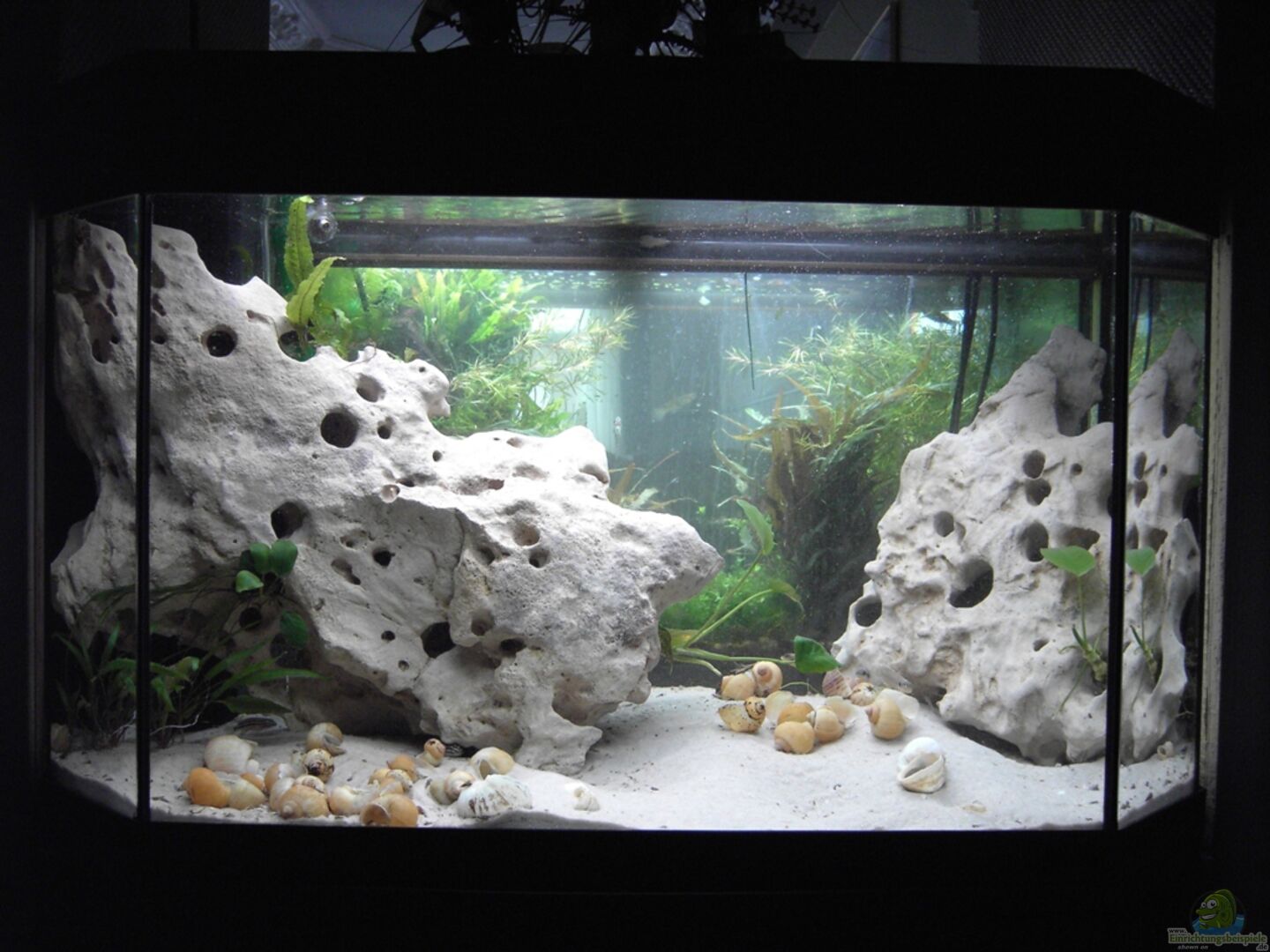 Das Becken ist eines von 2 Becken eins Doppelprojektes. Die Becken stehen in einem alten Türrahmen Rücken an Rücken und sidn jeweils durch das andere Becken zu sehen. Die beiden Welten sind sehr unterschiedlich, dieses Tanganjikabecken ist von hellem Lochgestein und Sand dominiert und strahlt sehr kühles Licht aus, das andere ist ein dicht bepflanztes Aquarium mit satten grün und rot Tönen.