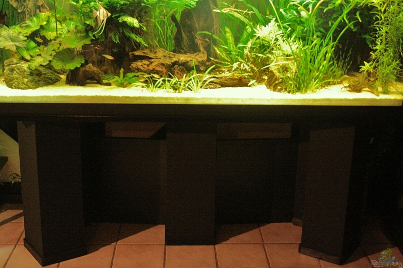 Das Becken ist von einem Aquarienbauer und ist Rundverklebt. Das Untergestell besteht aus 5 Porenbetonsteinen 20 x 24 cm worauf eine Küchenarbeitsplatte liegt.Beides ist fest miteinander verbunden.Zwischen Platte und Aquarium ist eine Moosgummimatte.Eine dünne Silikonnaht zwischen Platte und Becken damit kein Wasser drunterlaufen kann.
