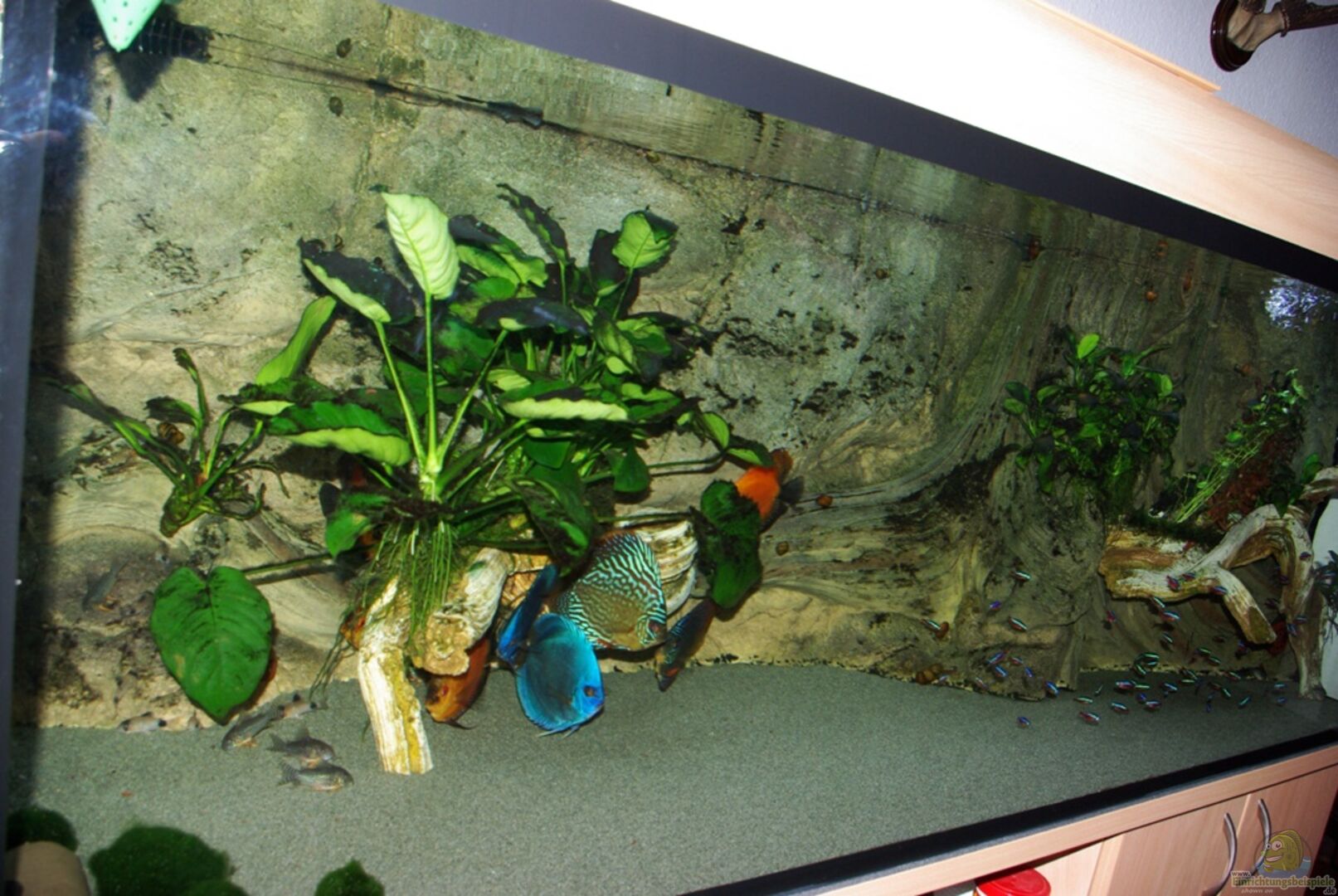 -2 gro??e Kunstoffwurzeln hellbraun (Futterhaus)(alle Pflanzen sind an diesen Wurzeln festgebunden oder an der Rückwand, der Bodengrund ist für die bessere Reinigung nur 1cm dick) -ich habe keine Echten Wurzeln verwendet da diese faulen können und die Diskus sich nicht wohlfühlen, die L 46 brauchen nicht zwingend Holz da sie Allesfresser mit tierischer Ausrichtung sind -1 Höhlenturm braun und grau als Stellfu?? für die Wurzel (als Unterschlupf für die Corys und die Zebras)