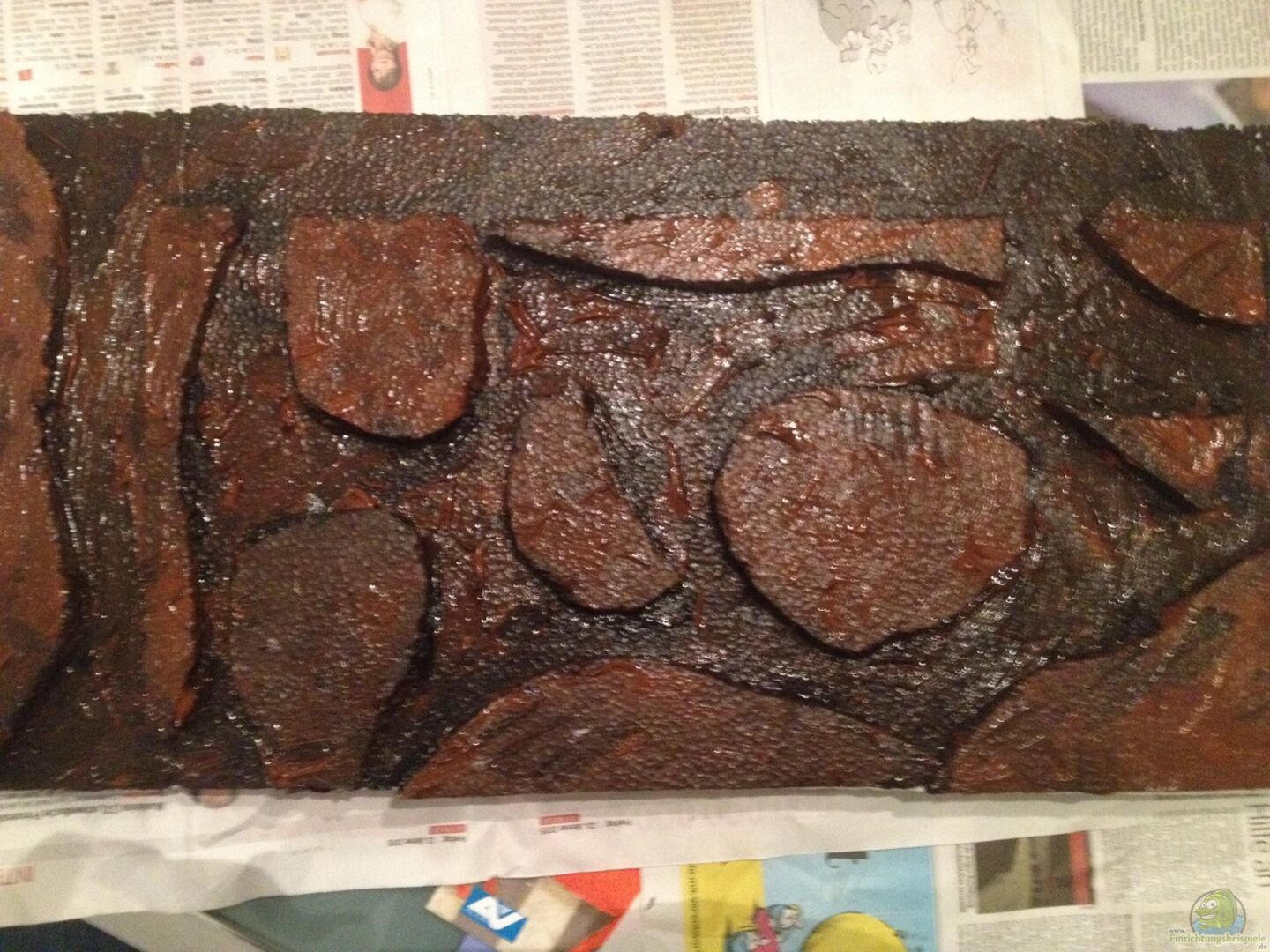 Moorkienwurzeln Schwarze Pappe hinter der Rückwand Erlenzapfen DIY Rückwand hinter dem Aquarium. Aus Styrodur mit brauner und schwarzer Acrylfarbe bemalt