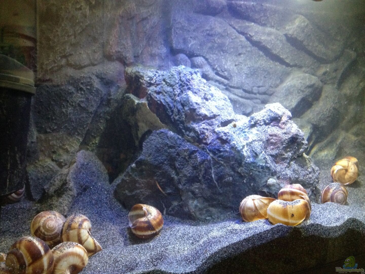 Eine alte Rückwand Stone Granite. Diese wurde zugeschnitten und als Rückwand eingesetzt. ca. 10 kg Basaltgestein xx Schneckenhäuser Ursprünglich wollte ich nicht so viele Schneckenhäuser drinnen haben, aber mein Sohn hatte einen ungeheuren Spa??, die Häuser ins Becken zu werfen, also was solls? Er hatte Spa?? an der Sache und das Interesse für sein Aquarium war auch da. Was gibt's besseres??