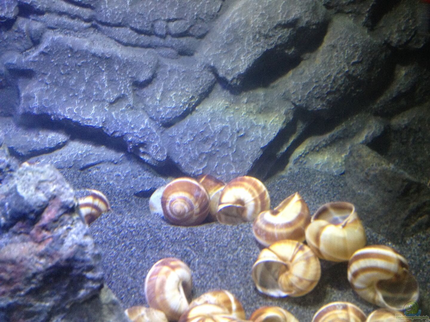 Eine alte Rückwand Stone Granite. Diese wurde zugeschnitten und als Rückwand eingesetzt. ca. 10 kg Basaltgestein xx Schneckenhäuser Ursprünglich wollte ich nicht so viele Schneckenhäuser drinnen haben, aber mein Sohn hatte einen ungeheuren Spa??, die Häuser ins Becken zu werfen, also was solls? Er hatte Spa?? an der Sache und das Interesse für sein Aquarium war auch da. Was gibt's besseres??