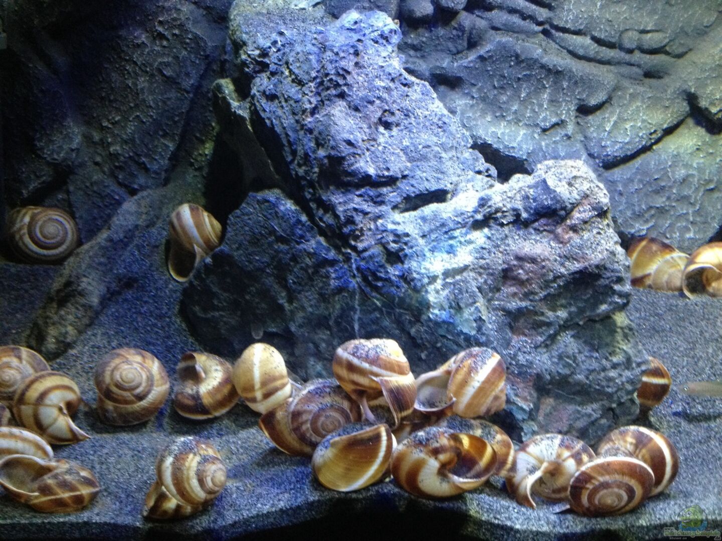 Eine alte Rückwand Stone Granite. Diese wurde zugeschnitten und als Rückwand eingesetzt. ca. 10 kg Basaltgestein xx Schneckenhäuser Ursprünglich wollte ich nicht so viele Schneckenhäuser drinnen haben, aber mein Sohn hatte einen ungeheuren Spa??, die Häuser ins Becken zu werfen, also was solls? Er hatte Spa?? an der Sache und das Interesse für sein Aquarium war auch da. Was gibt's besseres??