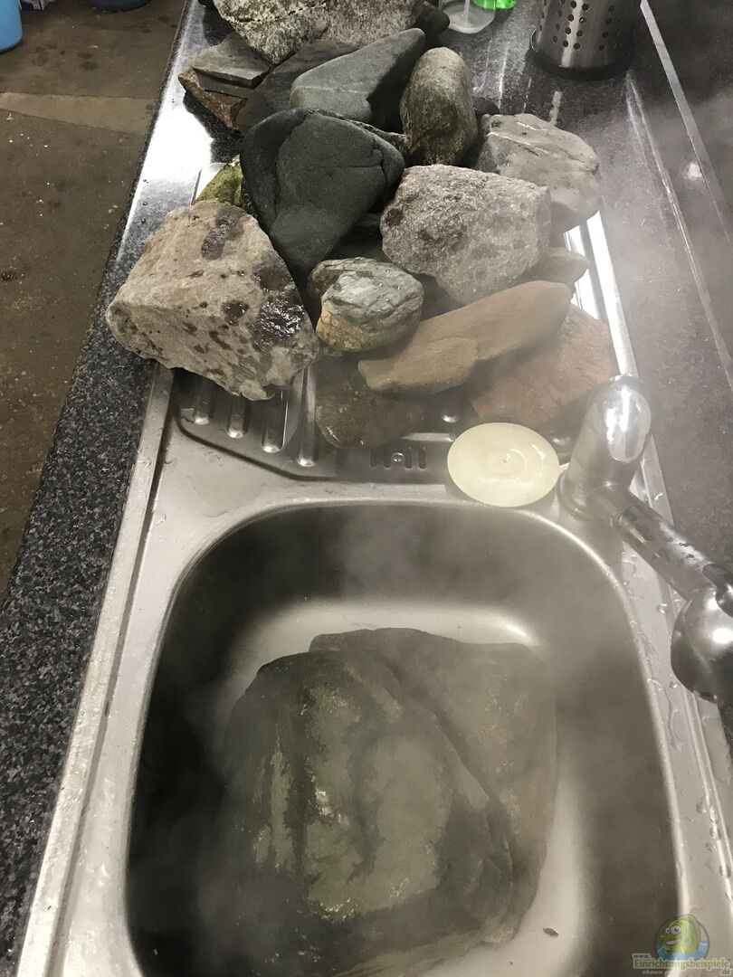 ca. 60 Kilo Steinaufbauten aus selbstgesammelten Steinen, die vorher abgekocht wurden. Es sind überwiegend runde Flussteine, sodass sich die Fische nicht daran verletzen können. Au??erdem habe ich noch flache und dünne Steinplatten, auf denen der Steinberg fu??t, eingebaut. So wird alles recht stabil. Verklebt habe ich die Steine nicht. Der Steinberg wird super von den Welsen als Unterstand angenommen. 4 gro??e Mangrovenwurzeln (aus meinem alten Aqaurium) 1 gro??e Moorkienwurzel etliche [...]