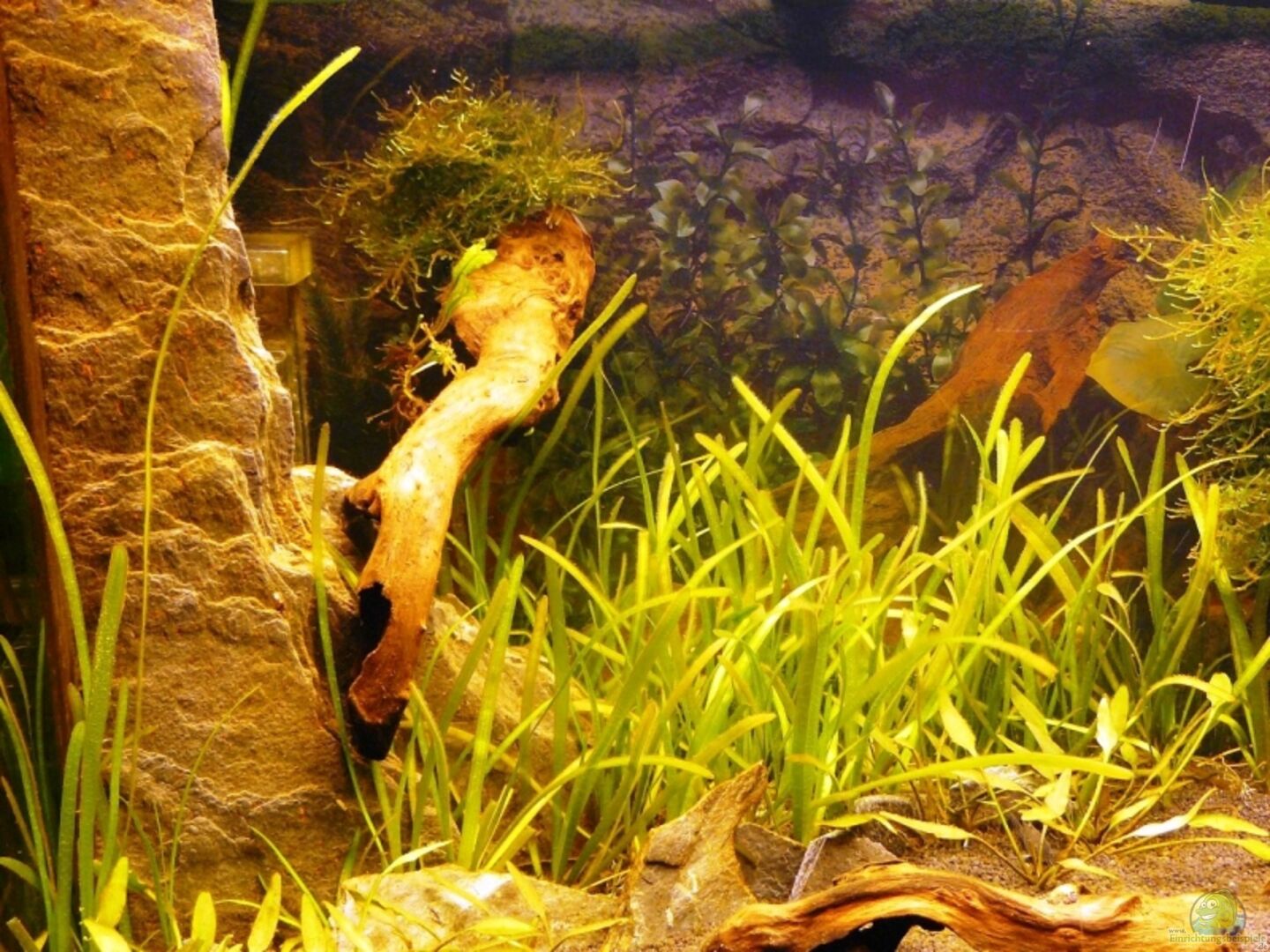 Deko : Bedruckte Rückwandfole, Schieferplatten, Moorkienwurzelen (teilweise mit Saugnäpfen an der Rückwandscheibe befestigt).