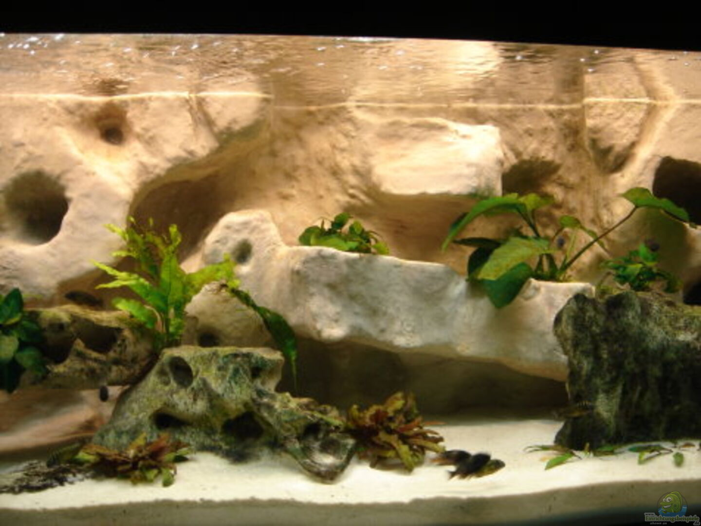 +selbstgebaute Rückwand aus Styropur, Fliesenkleber und Acrylfarbe mit Epoxidharz rundherum versiegelt und gut eingeklebt, im linken Eck Platz für Mattenfilter +ca 30 kg Lochgestein mit aufgebundenen Anubias