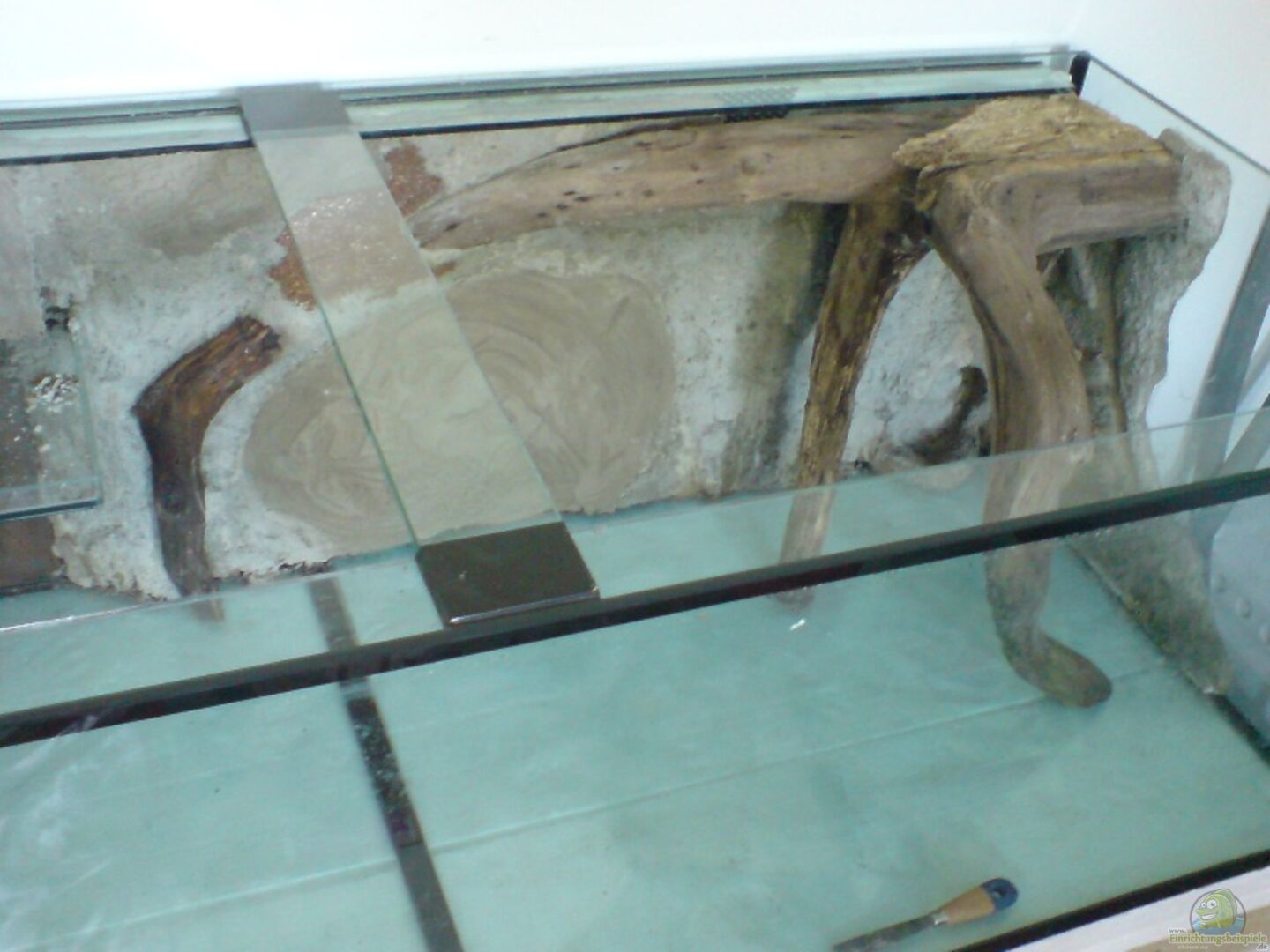 Komplette Rückwandgestaltung mit Treibholz und Eigenbaurückwand mit integrierter Wurzel oben erwähnter ´Balkon´ ist als Wasserbauwerk (Abflussständer, Steg, o.ä.) gestaltet und mit Holzplanken verkleidet