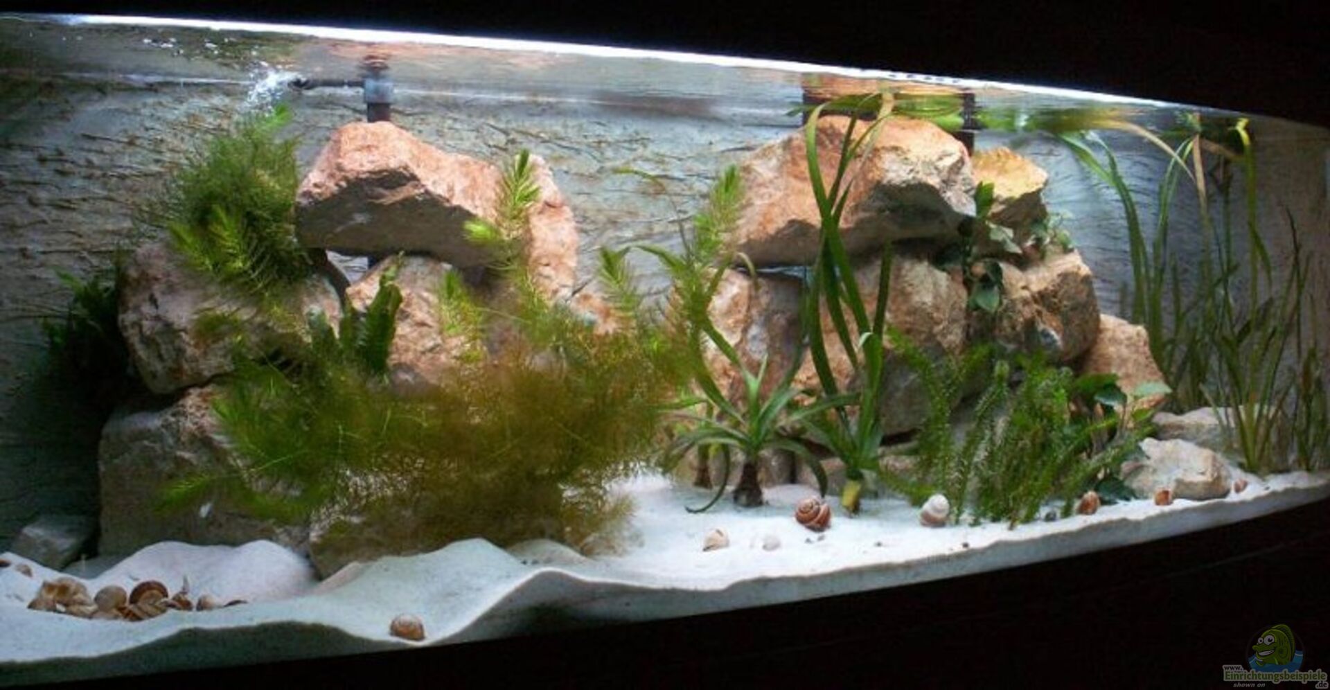 Die restliche Einrichtung bildet die selbstgemachte Rückwand (dünne gespachtelte Styrodurplatte mit ???lebensmittelechtem??? Flex ??? Fliesenkleber ein wenig gestaltet), Kalkbruchgestein vom Steinhandel (ca. 200 kg in gro??en Brocken) und ca. 30-40 Schneckenhäuser