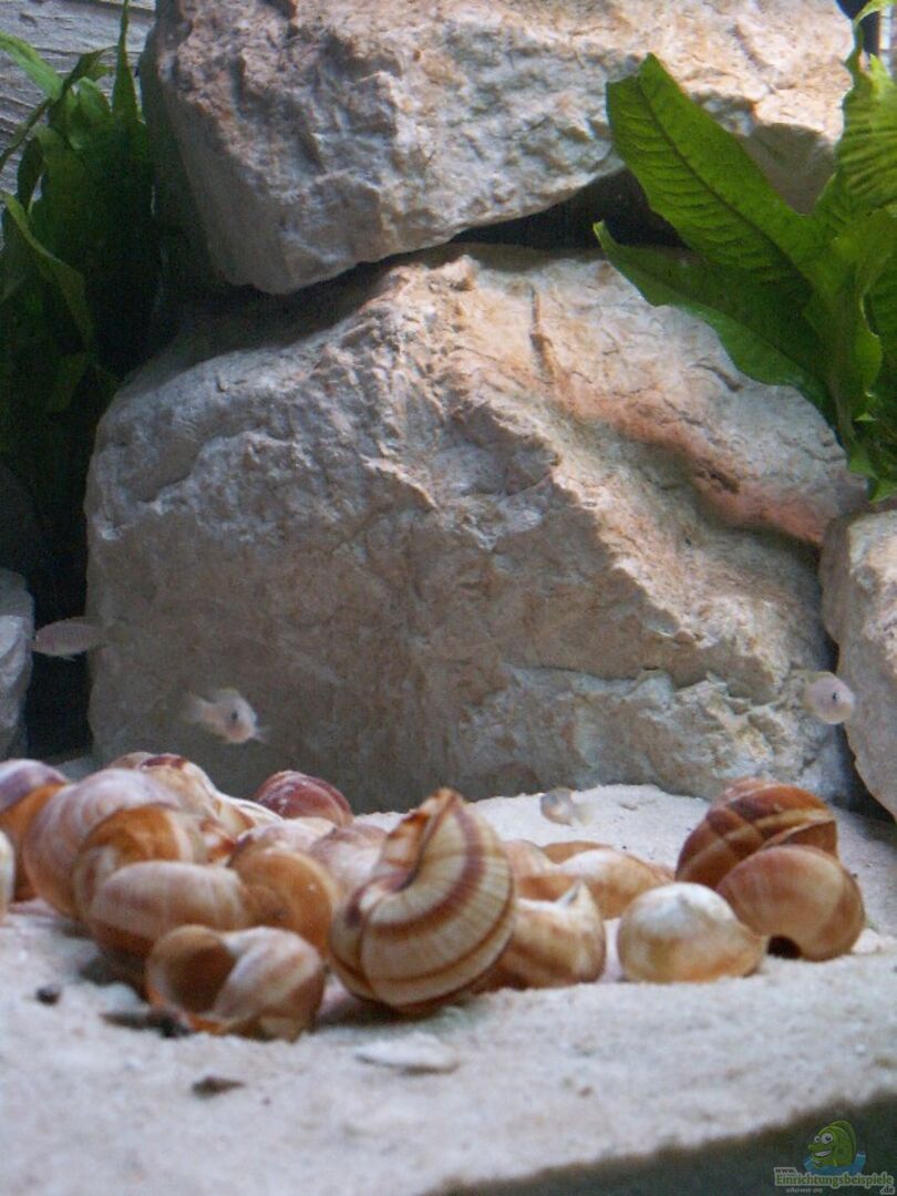 Die restliche Einrichtung bildet die selbstgemachte Rückwand (dünne gespachtelte Styrodurplatte mit ???lebensmittelechtem??? Flex ??? Fliesenkleber ein wenig gestaltet), Kalkbruchgestein vom Steinhandel (ca. 200 kg in gro??en Brocken) und ca. 30-40 Schneckenhäuser