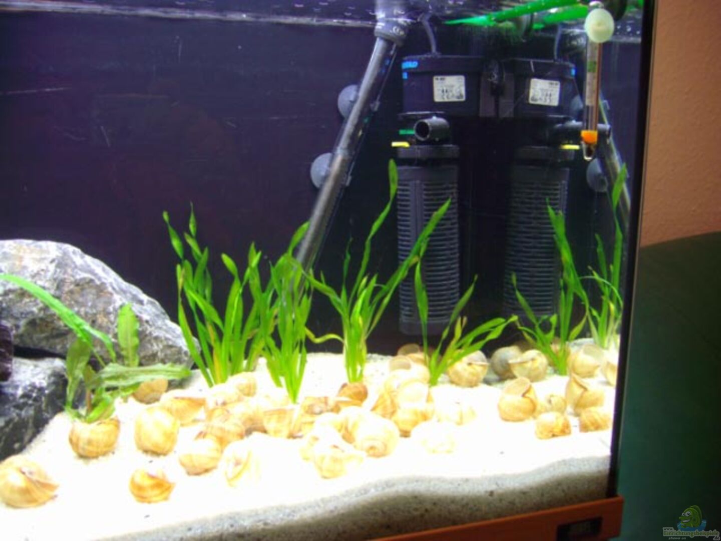 Steine aus dem Baumarkt in ´gletschergrau´; 45kg Rückwand schwarz gestrichen 40 x Weinbergschneckenhäuser (kleine Wurzel (Wurzel befand sich mehrere Jahre in einem anderen Becken und wurde mehrmals ausgekocht, keine Veränderung der Wasserwerte zu beobachten ;-)) Wurze ist raus!