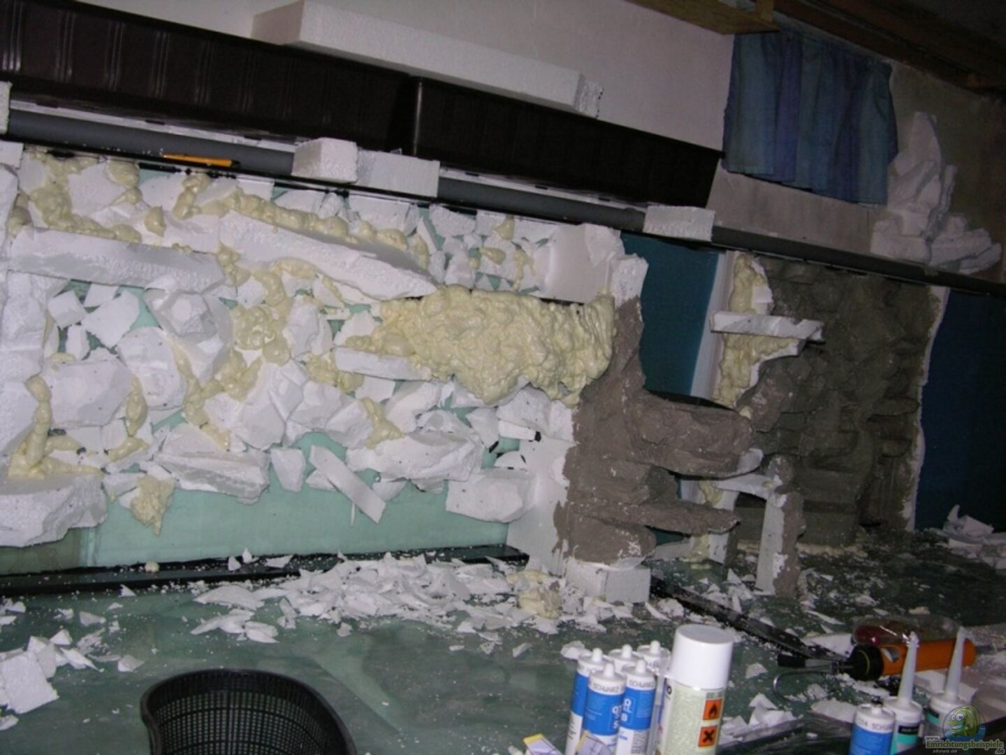 Rückwand aus Styropor, Fliesenkleber, Epoxyharz. Hat Wochen gedauert bis ich das halbwegs ansehnlich hinbekommen habe. mehrere grosse und mittlere Wurzeln