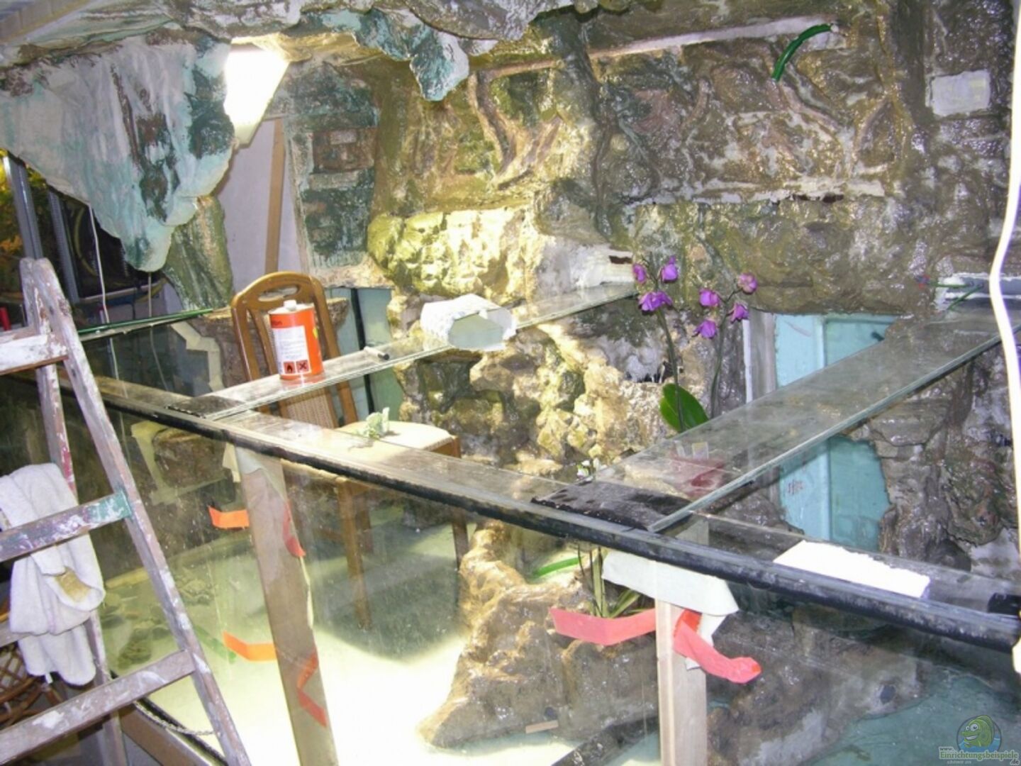 Rückwand aus Styropor, Fliesenkleber, Epoxyharz. Hat Wochen gedauert bis ich das halbwegs ansehnlich hinbekommen habe. mehrere grosse und mittlere Wurzeln