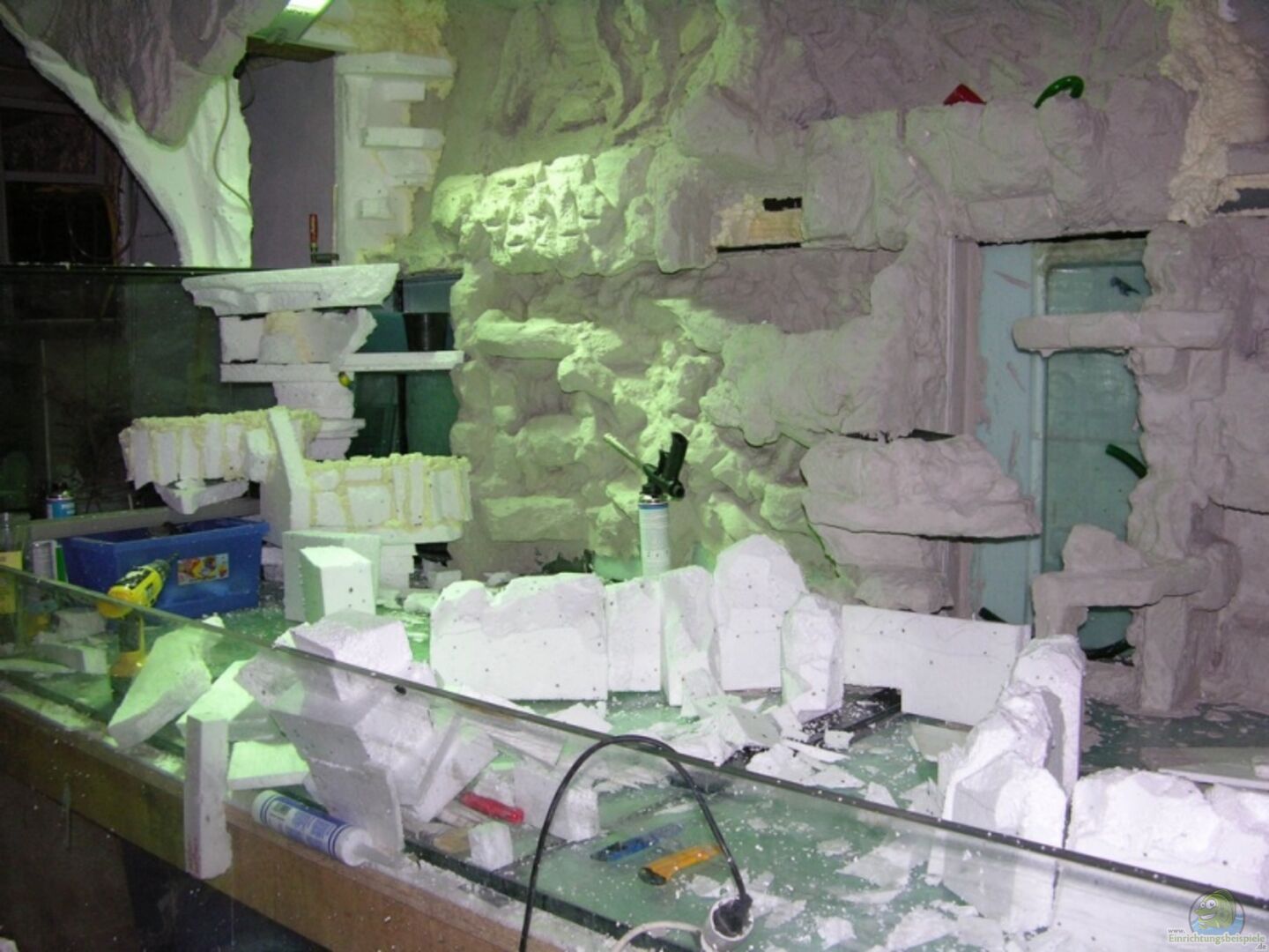 Rückwand aus Styropor, Fliesenkleber, Epoxyharz. Hat Wochen gedauert bis ich das halbwegs ansehnlich hinbekommen habe. mehrere grosse und mittlere Wurzeln