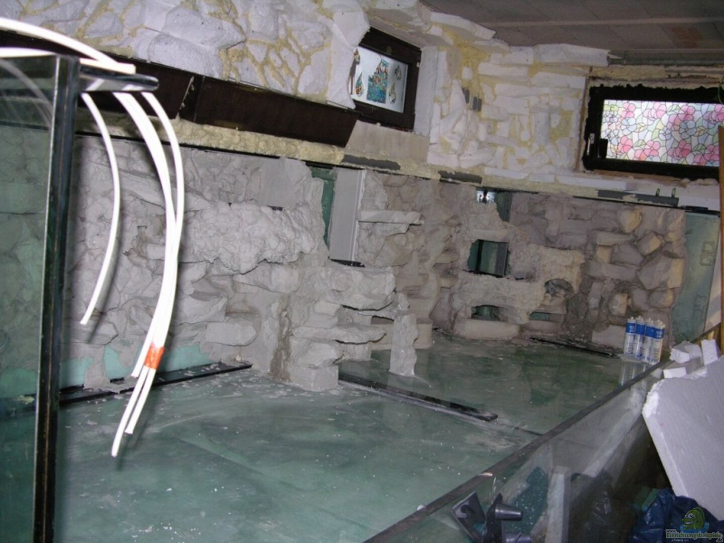 Rückwand aus Styropor, Fliesenkleber, Epoxyharz. Hat Wochen gedauert bis ich das halbwegs ansehnlich hinbekommen habe. mehrere grosse und mittlere Wurzeln