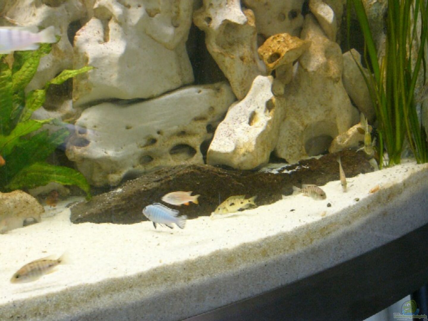 Steine 150 Kg. Als Grundgestell Kalksandsteine aus dem Baumarkt Stück 0, 30 ???, und mit Wei??en Lochsteinen verkleidet. Dadurch sind viele Höhlen entstanden u. die Fische können teilweise hinter den Steinenaufbauten Schwimmen.