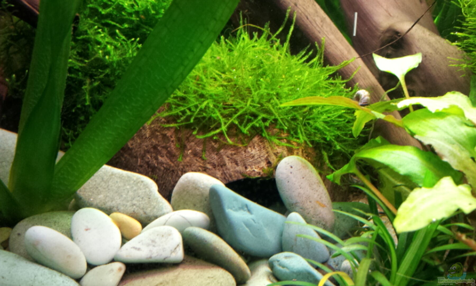 5 Moorkienwurzeln 1 Höhle aus Lochgestein 1 Höhle aus einer halben Kokosnuss mit Javamoos bepflanzt