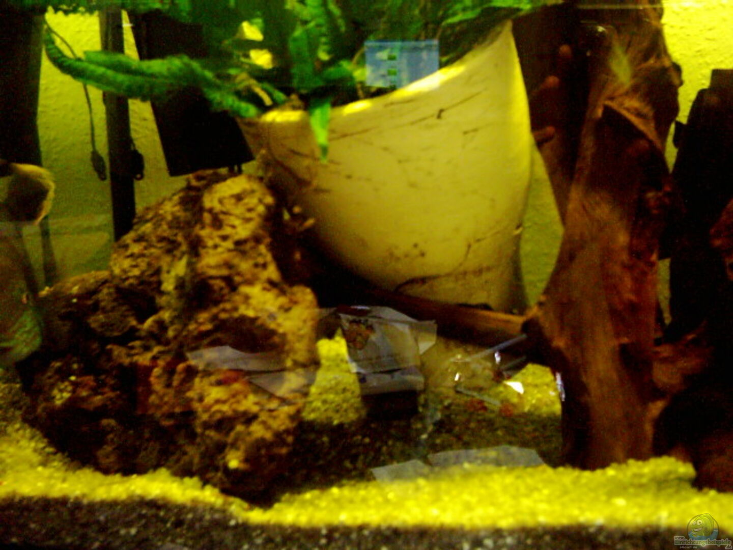 Rechte Seite: Bachsteine(aus dem heimischen Bach, gesäubert, abgekocht und extra mit Dampfstrahlgerät rüber gegangen) Mitte: 3 Riesen Wurzeln(Grö??e bis 50 cm) In die linke stehende Wurzel habe ich einen Blumenübertopf aus Terracotta reingeklemmt und 4 Handvoll Kies rein. Dort habe ich dann den Javafarn reingesetzt. Links: An der linken Wurzel befindet sich ein gro??er Lavastein.