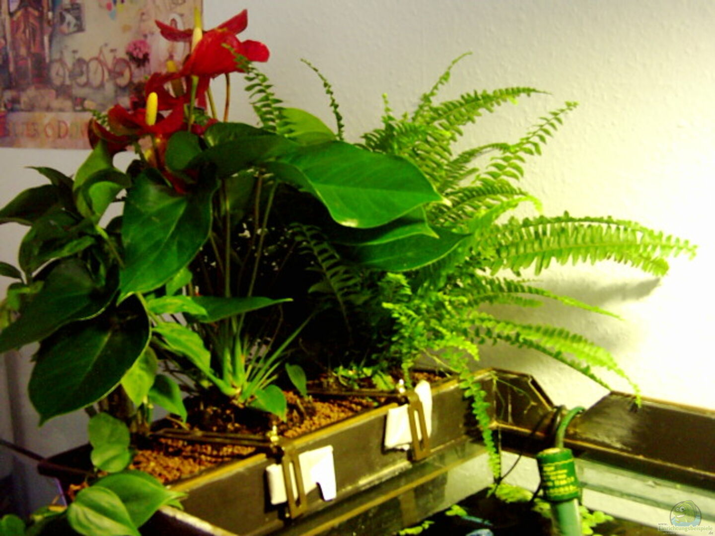 Rechte Seite: Bachsteine(aus dem heimischen Bach, gesäubert, abgekocht und extra mit Dampfstrahlgerät rüber gegangen) Mitte: 3 Riesen Wurzeln(Grö??e bis 50 cm) In die linke stehende Wurzel habe ich einen Blumenübertopf aus Terracotta reingeklemmt und 4 Handvoll Kies rein. Dort habe ich dann den Javafarn reingesetzt. Links: An der linken Wurzel befindet sich ein gro??er Lavastein.
