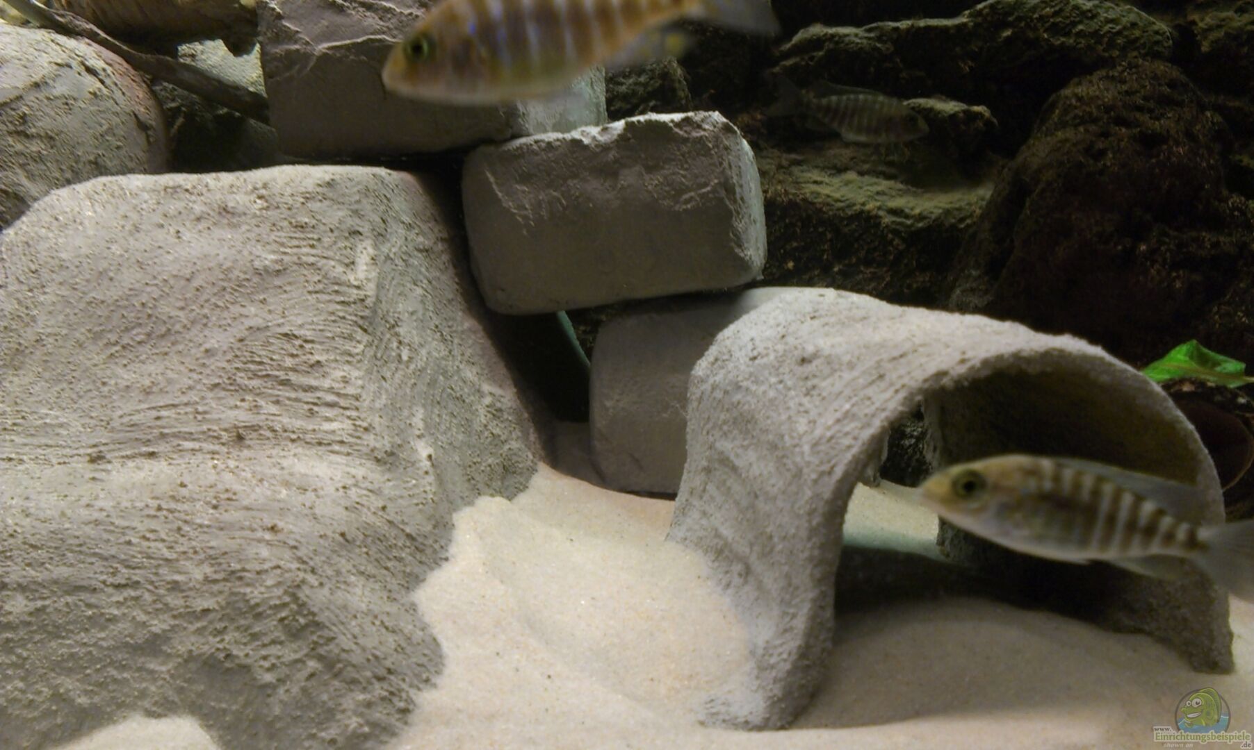 verschiedene Steine. Der grö??te Teil der Steine sind selbst gemacht aus Sand und Portlandzement mit Fliegengitter als "Gerüst". Diese wurden gewässert und dann ins Aquarium gegeben. Habe bereits beim Vorgänger gute Erfahrungen damit gemacht. Da fast alle künstlichen Steine hohl und mit ??ffnungen sind, ergeben sich noch mehr Versteckmöglichkeiten für die Barsche.