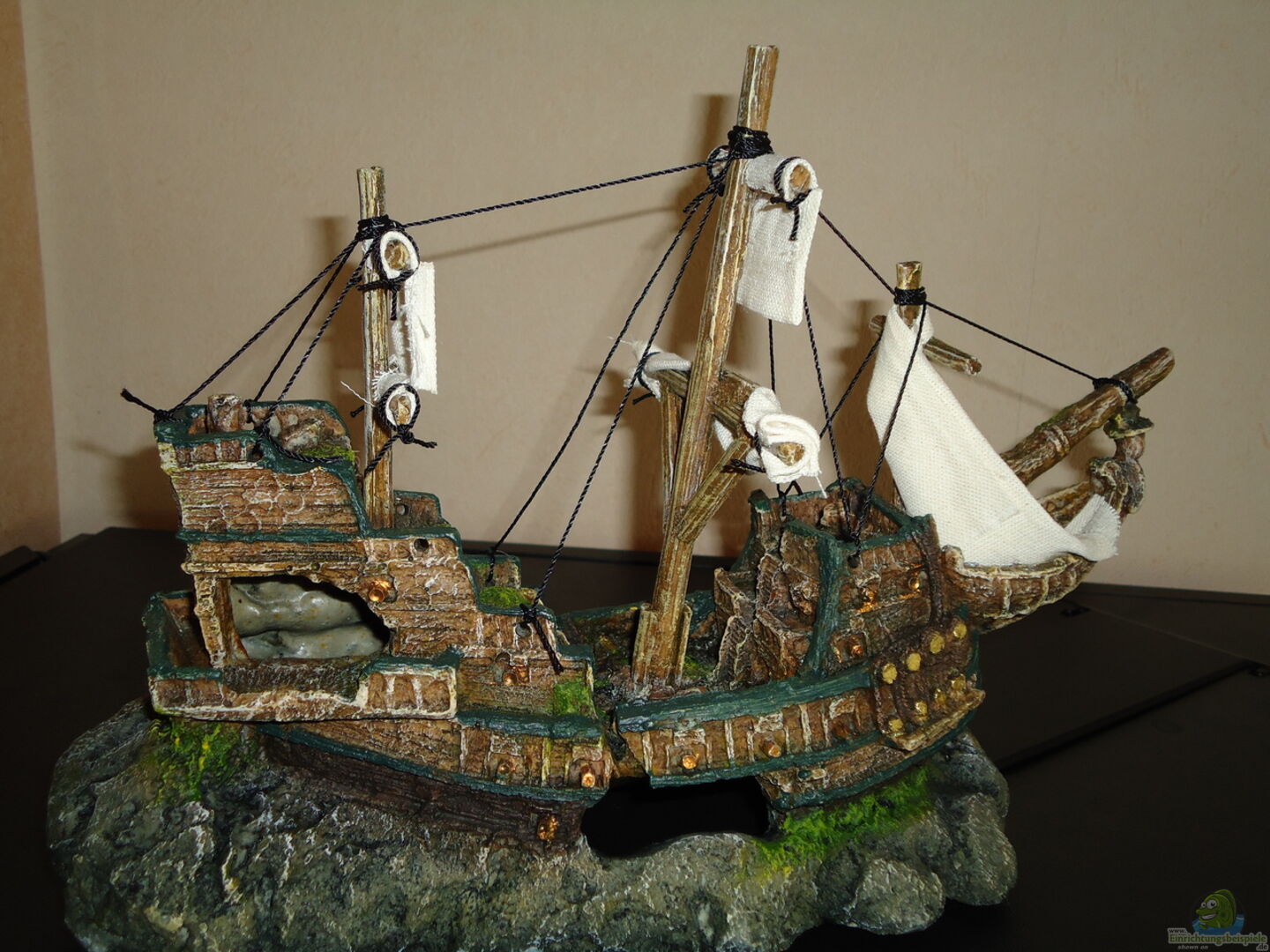 1 x Wurzel 1 x Deko - Schiff 2 x Brut-Röhre 1 x Kokosnusshälfte mit Einschwimmloch Steine zu zusätzlichen Verstecken aufgestockt