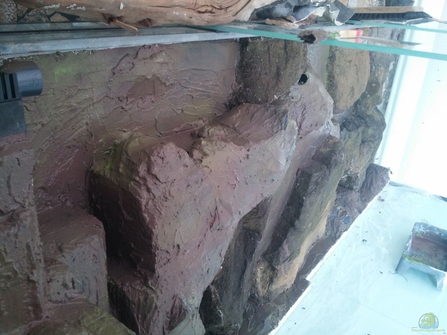 Selbst gebaute Rückwand auf Basis von 7 Back to Nature Rock Modulen, die auf Styropor geklebt sind und mit Fliesenkleber verspachtelt wurden. Nach einer farblichen Anpassung habe ich die Rückwand mit Epoxidharz versiegelt. In die Rückwand sind mehrere Höhlen aus Pvc Rohren integriert. Welshöhlen aus Schiefer, diverse Moorkienwurzeln,
