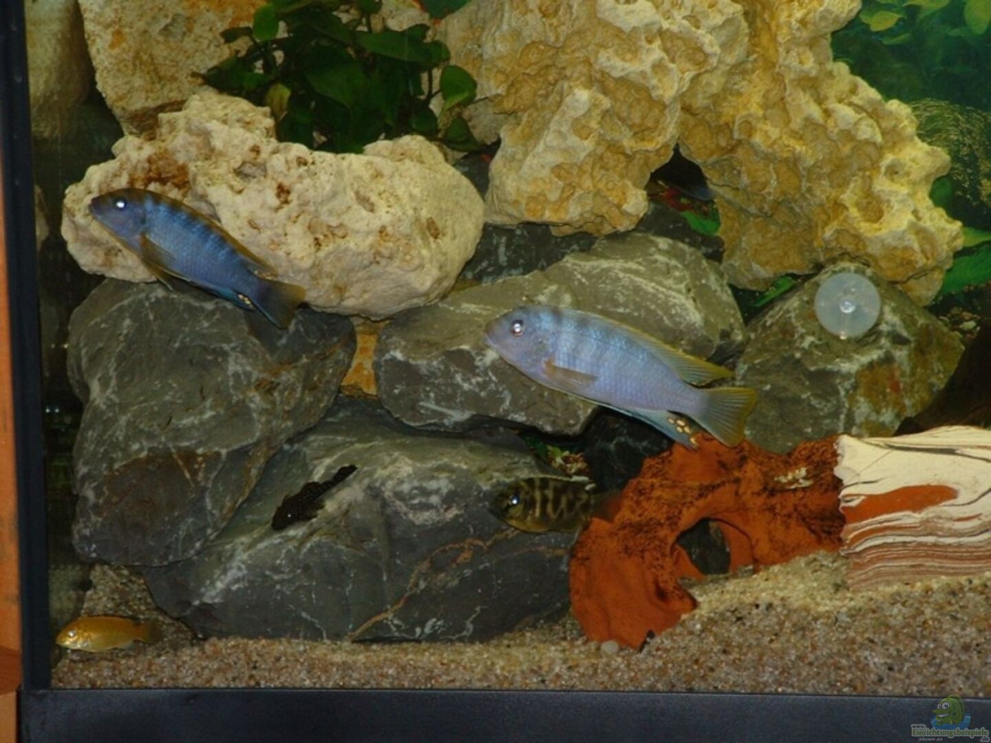 ca. 55 Kg verschiedene Steine darunter Lochgestein wurde so aufgebaut das den lebendigen Mbunas sehr viele Höhlen zu Verfügung stehen, und dennoch genügend freier Schwinnraum im vorderen Teil des Beckens übrig bleibt.Die Steine sind auf einer 2 cm dicken Styroporplatte aufgebaut.