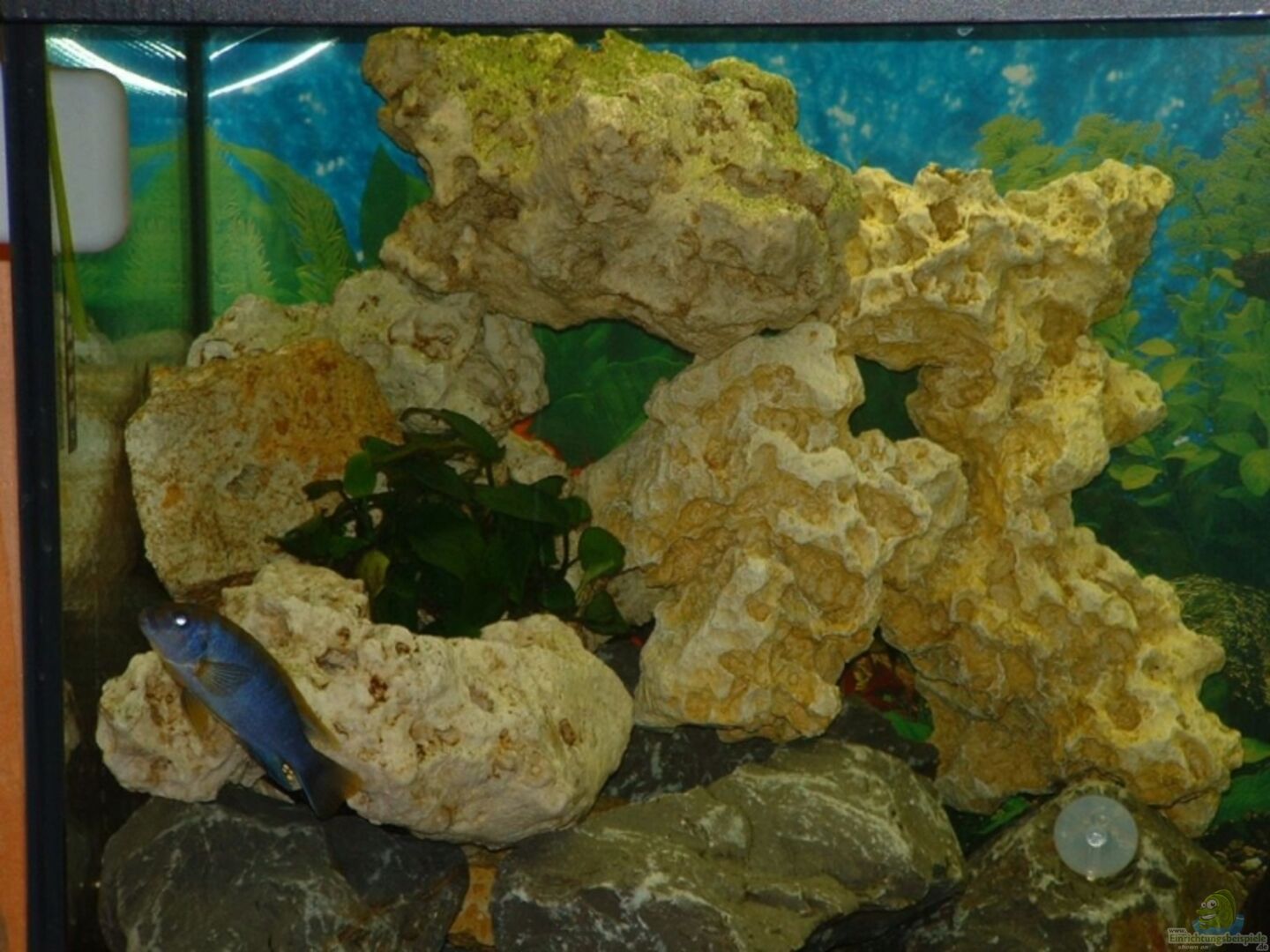 ca. 55 Kg verschiedene Steine darunter Lochgestein wurde so aufgebaut das den lebendigen Mbunas sehr viele Höhlen zu Verfügung stehen, und dennoch genügend freier Schwinnraum im vorderen Teil des Beckens übrig bleibt.Die Steine sind auf einer 2 cm dicken Styroporplatte aufgebaut.