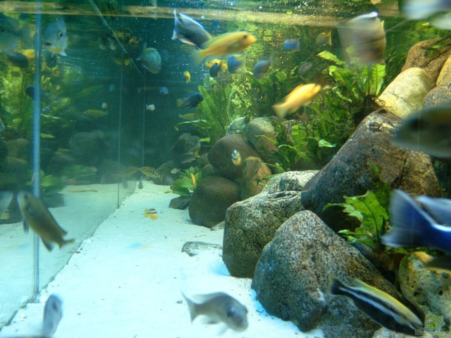 Sehr gro??e Flusskiesel sind zu einer kompletten Felswand zusammengesetzt, ergeben viele Höhlen, wo sich bedrängte Tiere und bruttragende Weibchen zurückziehen können. Freie Sandflächen bieten den Nicht-Mbunas genügend Schwimmraum und Gelegenheit zum Suchen nach Futter. Da Malawis Laichgruben anlegen und dadurch die spiegelnde Bodenscheibe zusehen ist, habe ich sie wie folgt gestaltet. Zuerst wurde die Bodenscheibe mit transparenten Aquariensilikon beschichtet (Spachtel) und sofort mit Quarzsand [...]