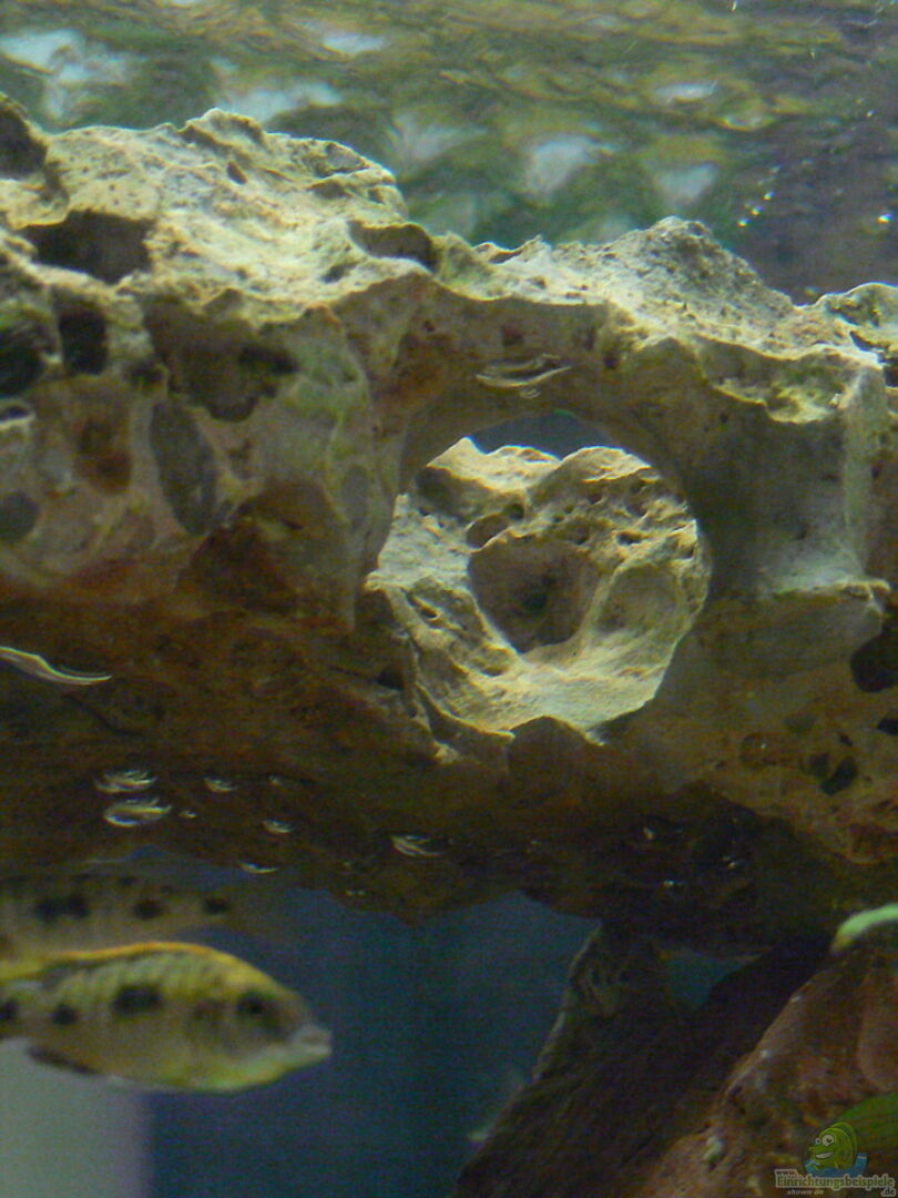 Lochgestein, ausgewählt mit sehr vielen grö??eren Löchern zu einer ´Rückwand´ aufgetürmt. Dieses Lochgestein gibt meinen Jungtieren genügend Möglichkeiten, sich verstecken zu können. Habe ziemlich lange beobachtet, um festzustellen, ob das mit dem Raumteiler funktioniert......habe noch nichts negatives bemerkt.... nein im Gegenteil, Tiere färben super aus. (Siehe Bilder)