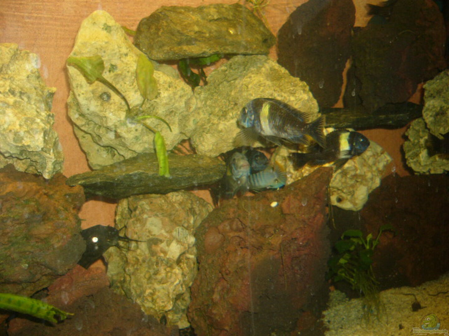 Statt einer rück-und seitenwand habe ich die wände miit gestein verkleidet , Diese habe ich im Becken so angeordnetdas sich viele Spalten und gro??e/kleine Höhlen ergeben .So können die Barsche Reviere abstecken und sich auch mal `aus dem Weg gehen.Auch der direkte Blickkontakt kann so vermieden werden. Da die Steine gleichzeitig aufgebaut sind, können sie schön durchschwommen werden.da das Gestein an der Rück , Seitenwände bis zur abgeckung gestapelt ist, Sieht man natürlich den Heizstab [...]